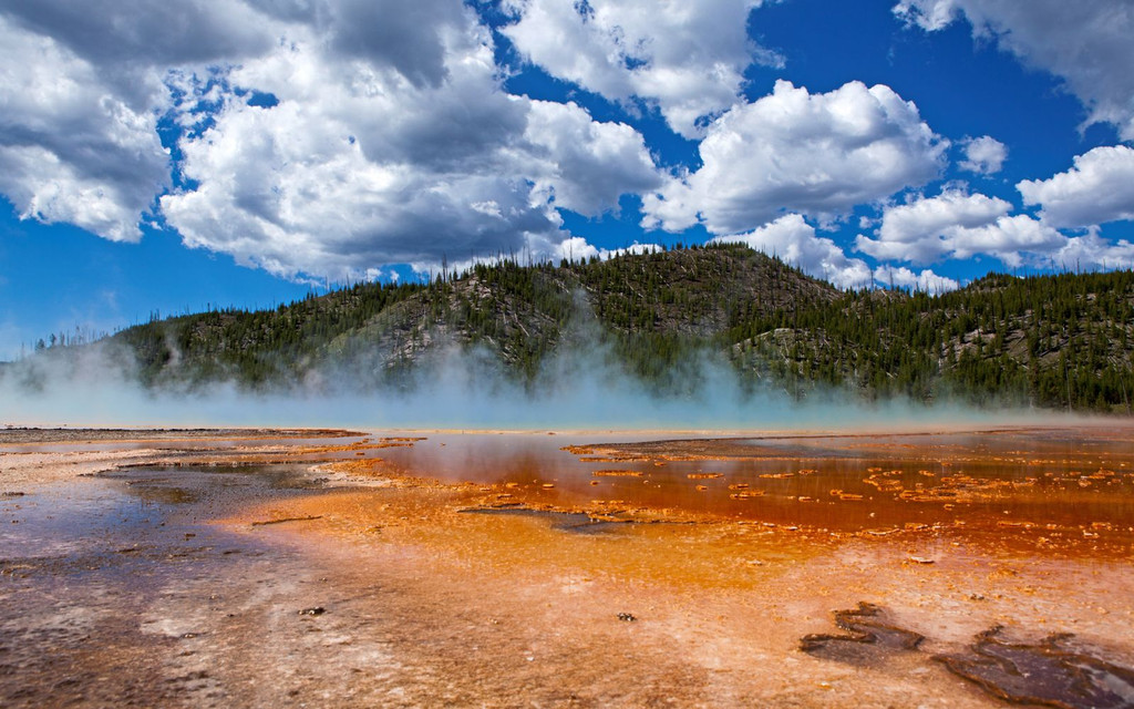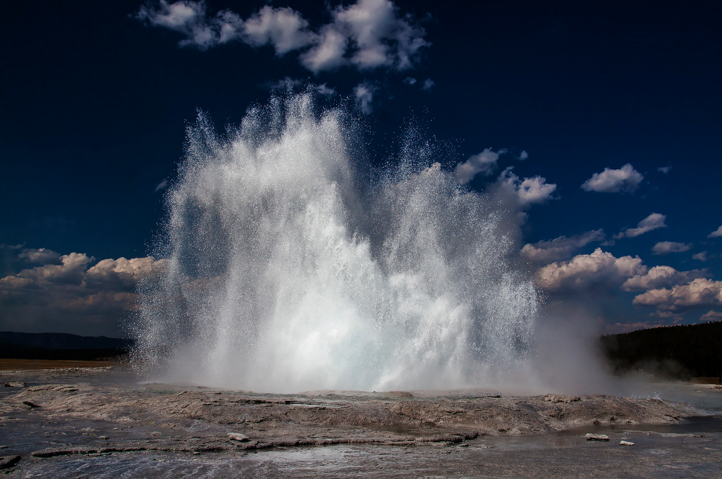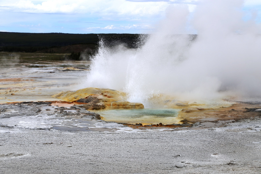 黄石公园的热喷泉为世界之最,人们统计出有3000多处温泉、泥泉和300多个定时喷发的间歇泉。尤其是间歇泉,更是黄石的骄傲。黄石公园地形基本呈一种凹形,冬季降雪极多,提供了它丰富的地下水源。地上的水很容易流入和渗进地里,最后流到温度远超过沸点的地底深处,受到地热持续的加温由冷转热,沸腾后化为蒸汽。在巨大的压力之下,蒸汽要找一条出路。如果蒸汽给往下流的流水堵住了,水的质量使蒸汽不能逸出空隙。就这样过了一段时间,因为蒸汽的压力不断增大、热度不断加高,最终挟着泉水喷涌而出,这就形成了间歇泉。典型间歇泉快要喷发时,人们能看见水先从小洞里流出,或者发现水流量突然增加,接着,从地底深处传来轰轰雷鸣,这就表示蒸汽突破了水的阻碍。然后,喷口的水柱被水蒸气抛升起来,时间持续几秒钟到几分钟不等。在水柱喷出的同时及之后一段时间,还能听到水蒸气隆隆的轰鸣,仿佛宣泄着内心的兴奋。最后,地下的压力解除,水蒸气喷射的力量也消失了,于是水再开始注满喷口,阻塞水蒸气的出路,酝酿下一次的喷发。