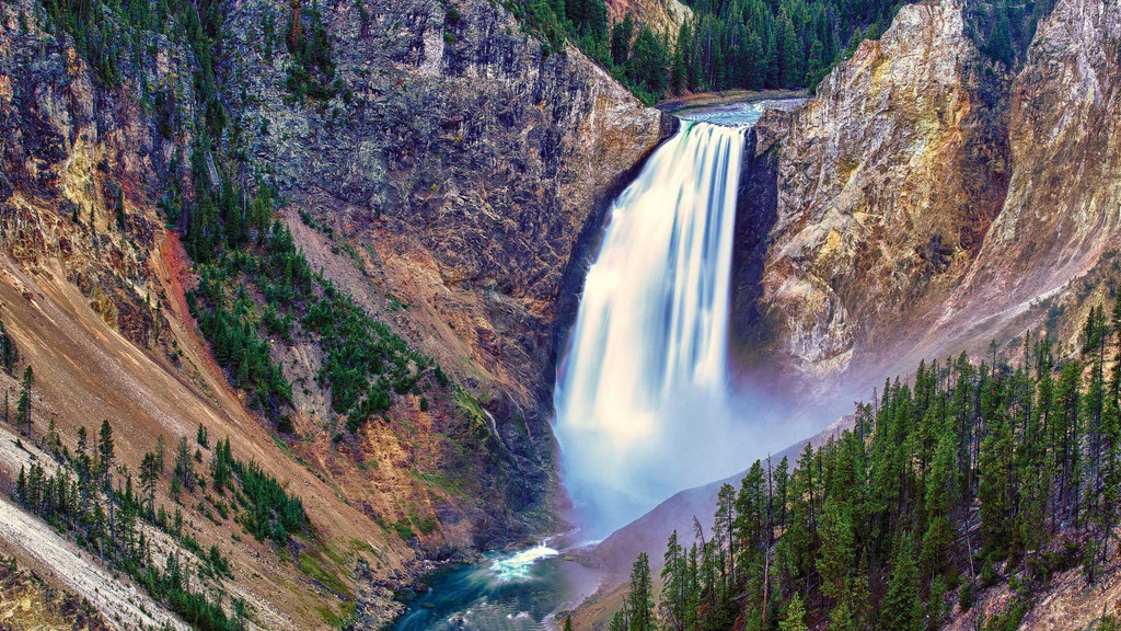 黄石峡谷位于钓鱼桥和高塔之间,由黄石湖流出的河水,流经大约3 8公里地带所造成的险峻峡谷,就通称为黄石大峡谷。这里是黄石公园最壮丽、最华美的景色。97公里长的黄石河是“美国境内惟一没有水坝的河流”。在这里,河水陡然变急,冲开四溅的水花,形成两道壮丽的瀑布,轰鸣着泄入大峡谷。这两个瀑布一个有130米高,这是上瀑布;另一个有100米高,称为下瀑布。