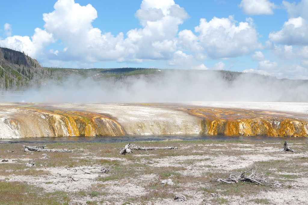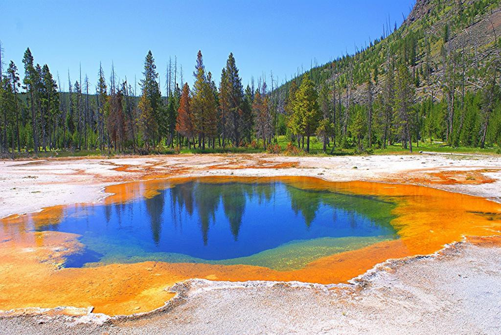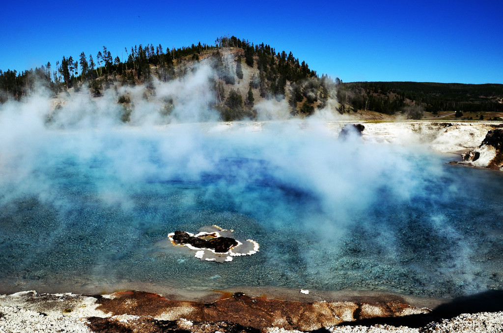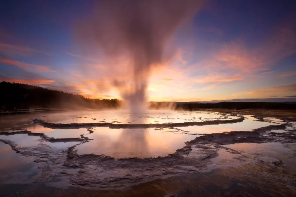 黄石公园的地热景观是全世界最著名的。数以千计的沸泉和池水碧蓝的大湖深潭波涛汹涌,山声鼎沸,仿佛一炉烈焰正在熊熊燃烧。上百个间歇泉喷射着沸腾的水柱,冒着滚滚蒸汽,好似倒转的瀑布,它们从火热而黑暗的地下世界不时喷涌而出。一些间歇泉的水柱气势磅礴,像参天大树,其直径从1.5米到18米不等,高度有45米至90米。巨大的力量可以使它在这样的高度上持续数分钟,有的可持续将近一个小时。