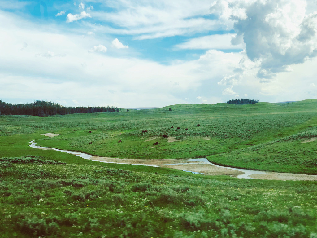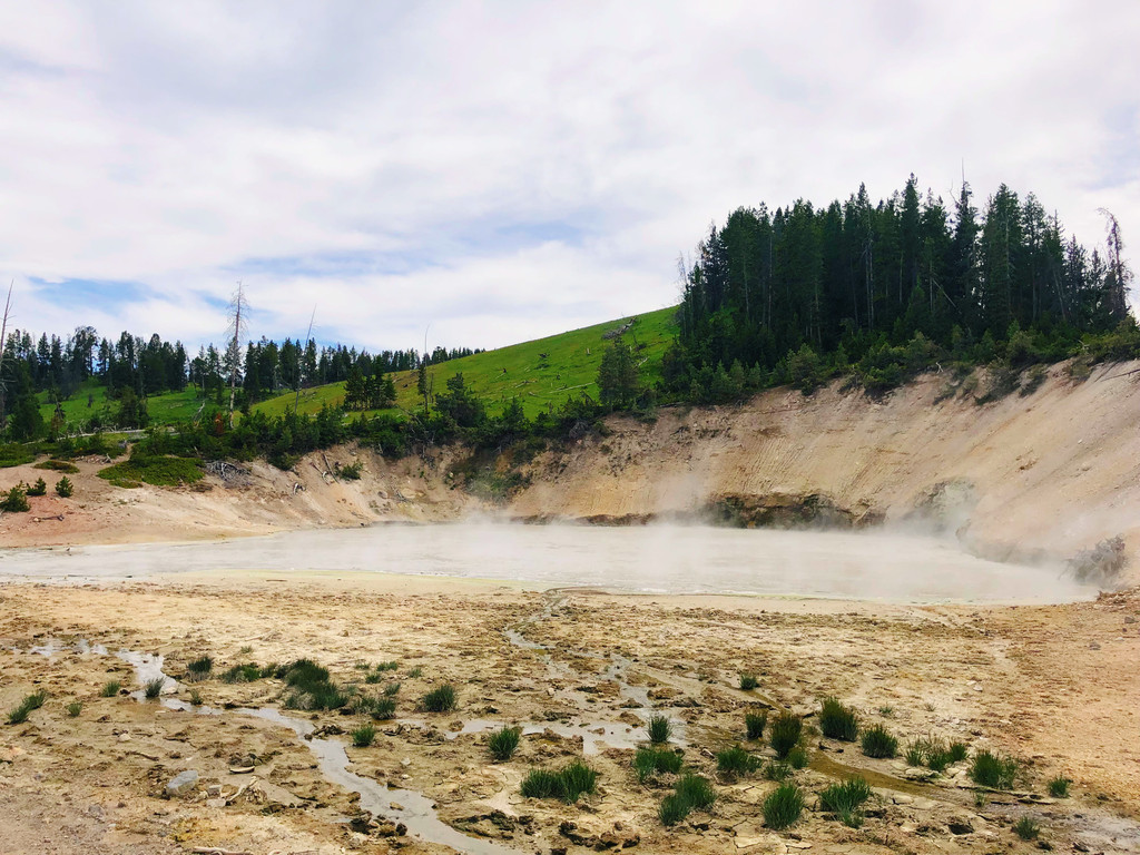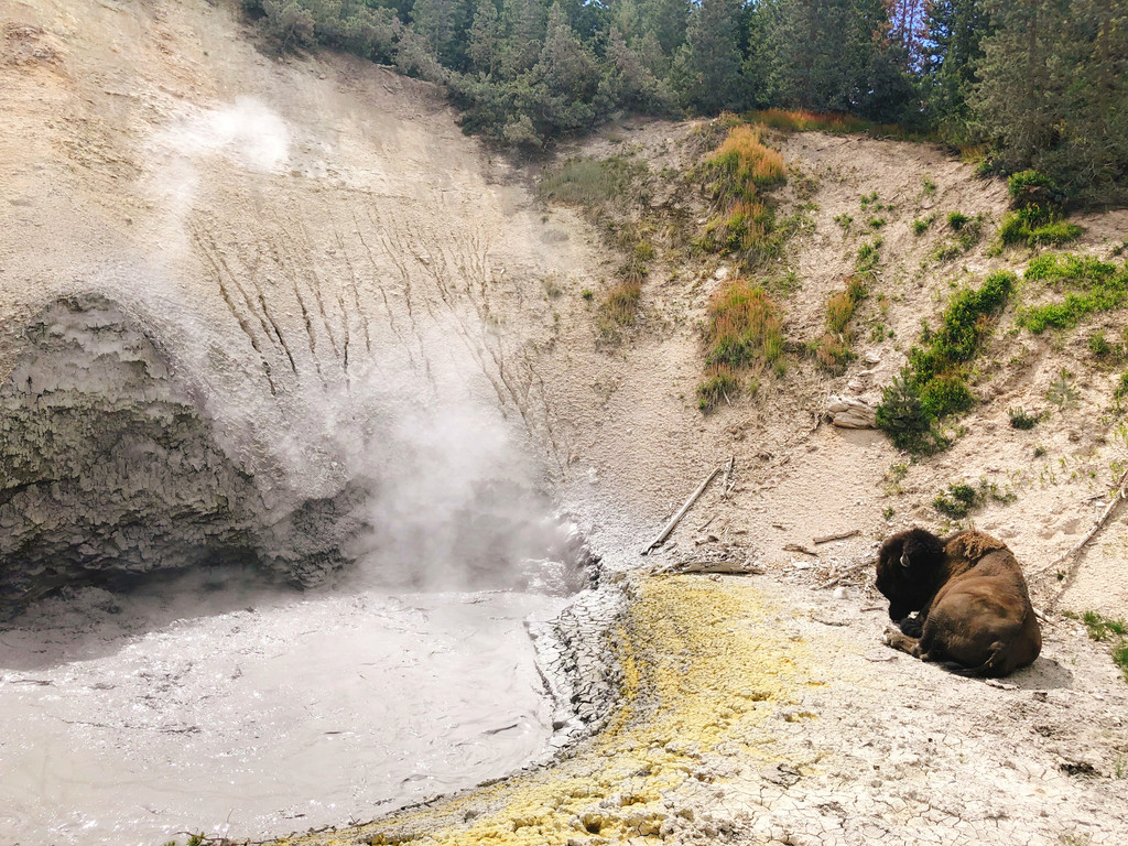 第一个停留的景点是Mud Volcano,在附近看到了很多野牛Bison迁徙。由于高温岩浆长久的加热着地表下的水和泥,形成泥水滚动,释放出含着硫的气息,不建议在此处气味不好的地方停留太久。