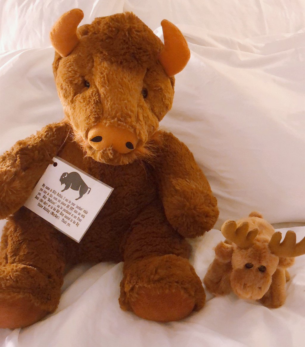 下面这张照片的左边的是酒店房间的玩偶,长得特别像在黄石公园里面挡在车前面的野牛,牌子上写的是“不要把我带走,把美好的记忆带走就好。如果实在想带走,就去楼下纪念品店里买一个吧”。结果我就去买了一个,不过是右边那个小的麋鹿,方便携带,算是我所有旅游纪念品中很可爱的一只。