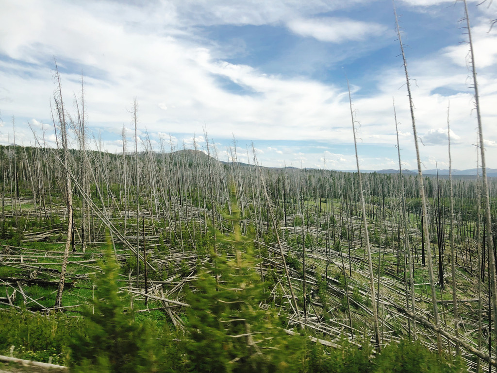 黄石森林火灾在历史上也都是很大规模的,公园内每年都会发生山火,其中最大的一次是1988年黄石公园大火,当时公园内近三分之一的面积被烧毁。看这一片片的枯树就能感受到,天火给自然界循环带来的推动力量。。
