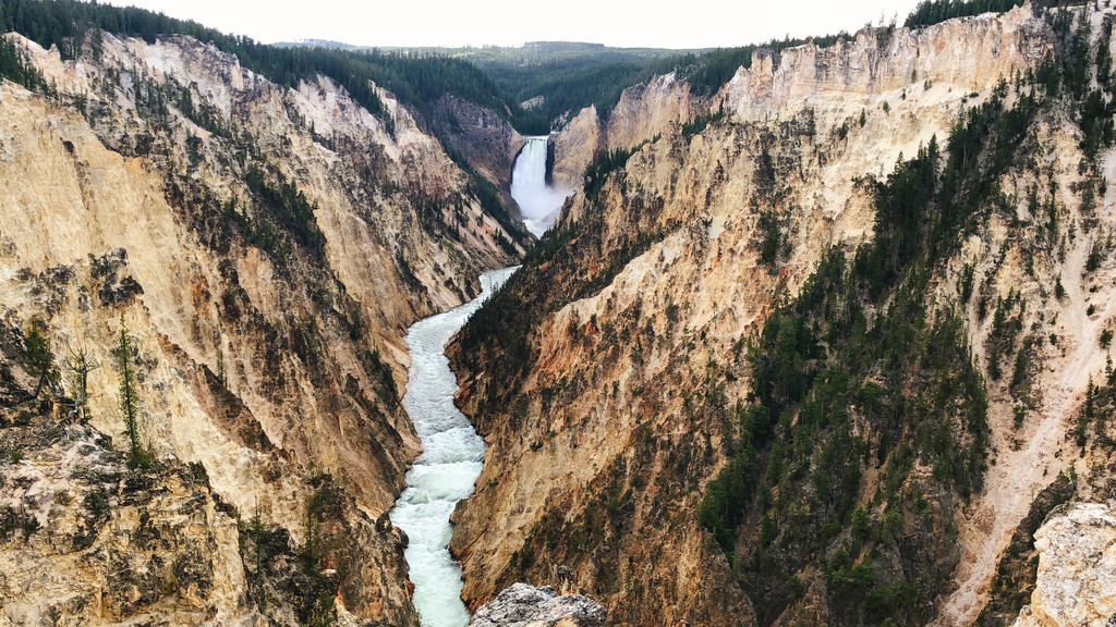 下一个景点就是车程20分钟左右到达的Upper waterfall黄石瀑布了。其全景词穷到只能用壮观来形容。瀑布水由火山上雪水融化而来,后汇入密西西比河。此处也便是黄石大峡谷了。话不多说,直接霸气上图。