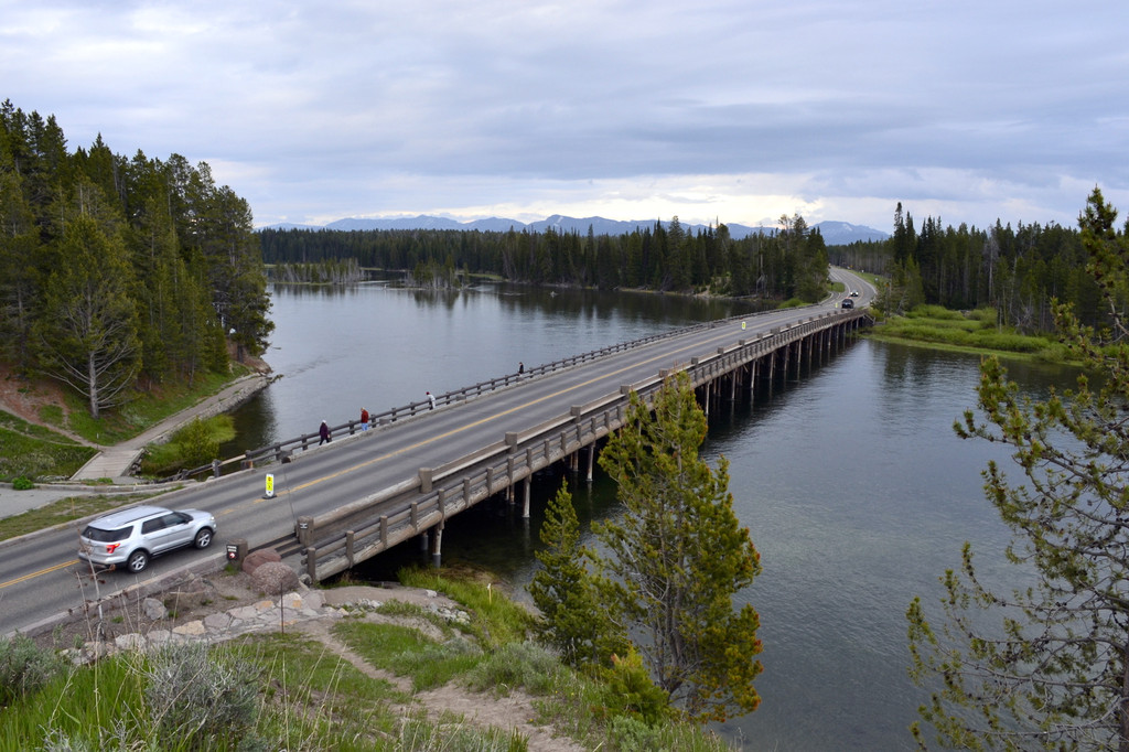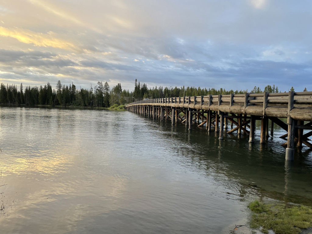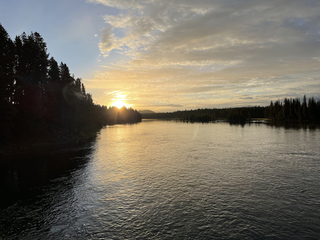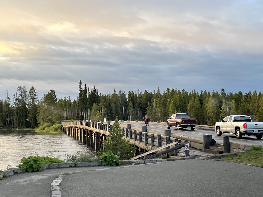 阴雨天让宿营变得没那么美好,好在带了便携炉具,在车后勉强应付了晚餐。睡袋又被水打湿,这注定是一个不眠夜。清晨天总算放晴了,气温却在0度徘徊。驾车前往Fishing Bridge 看日出,宿营的优势体现出来。