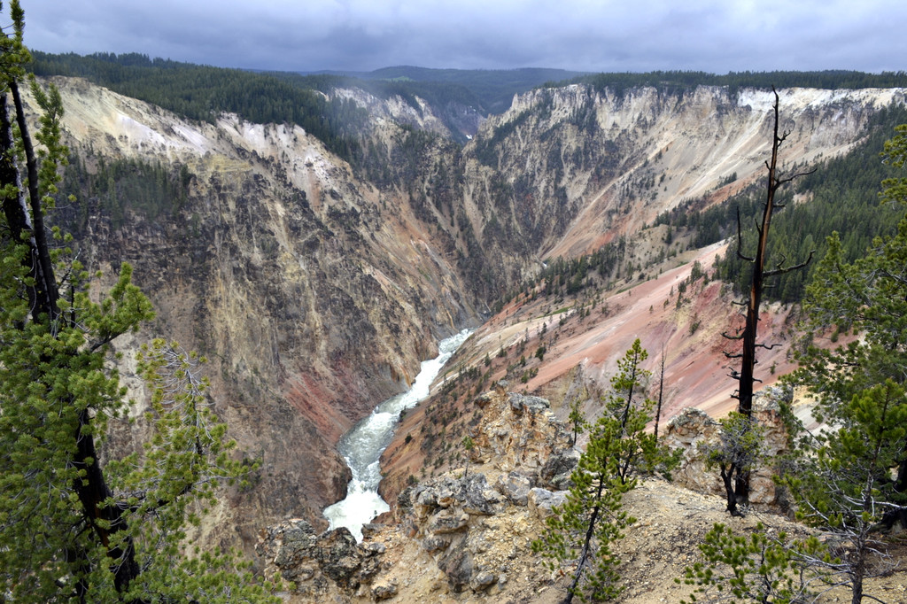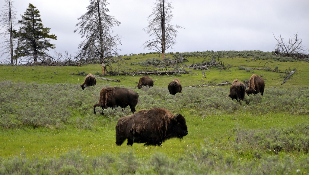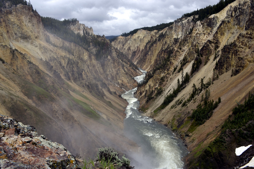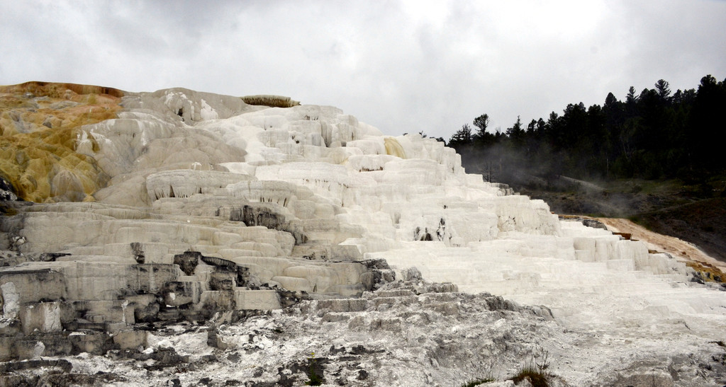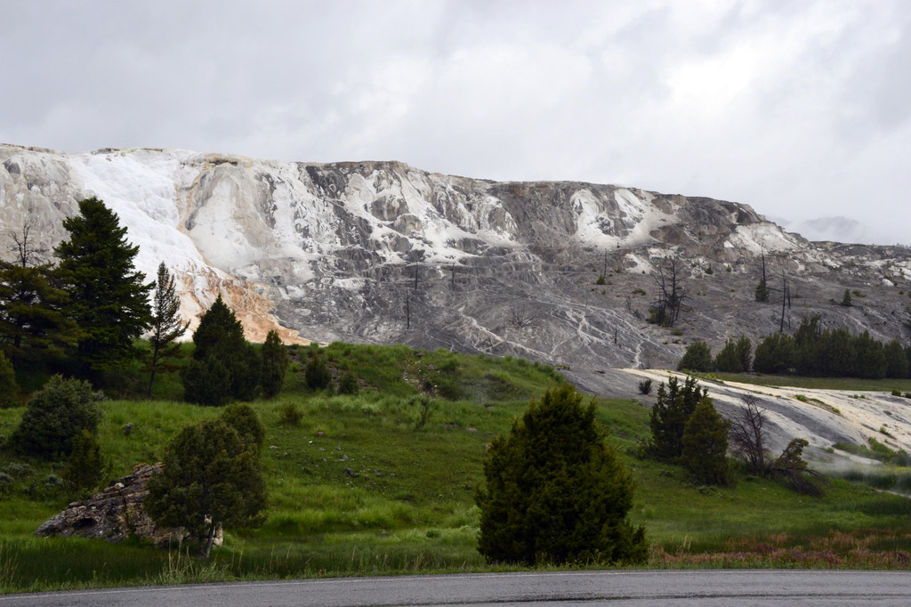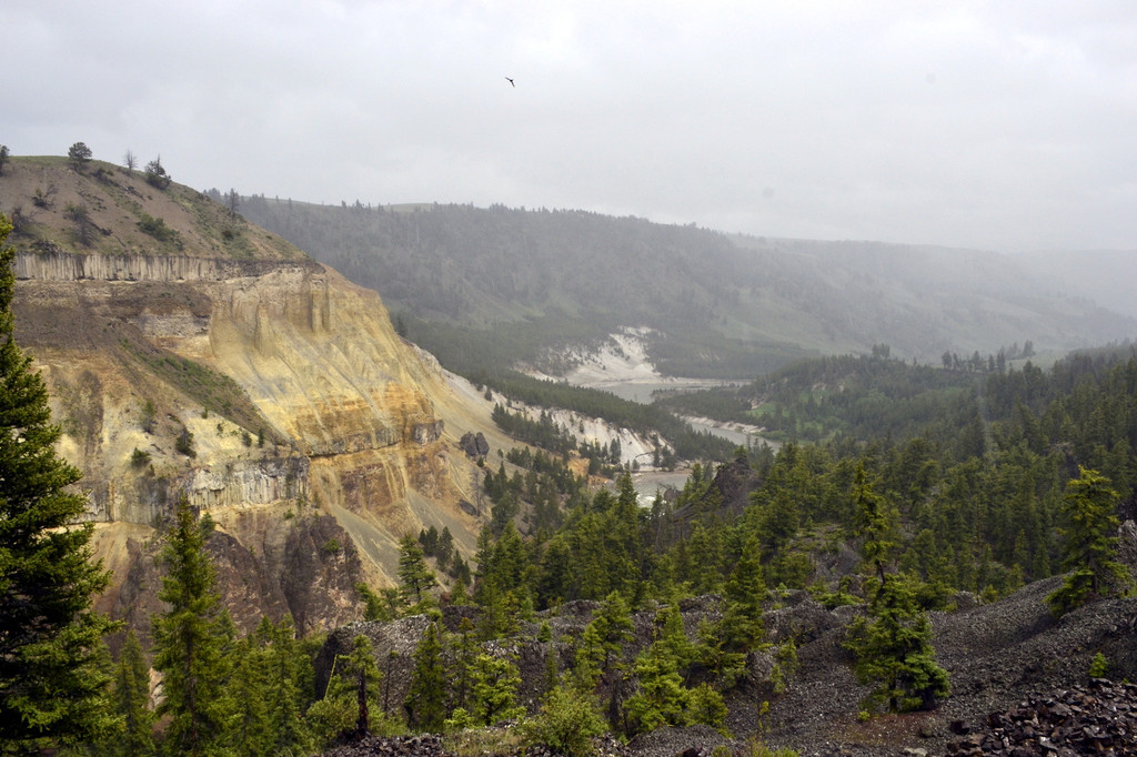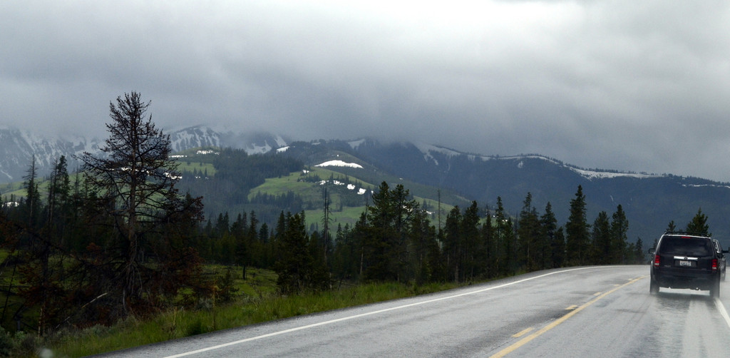 天公不作美,宿营的当晚就开始了小雨,温度也巨降,虽有备而来,还是感慨运气不佳!雨没有停止的趋势,原计划的徒步也泡汤,无奈,黄石的深度游也只能变成走马观花了。离开营地,过了峡谷 (Canyon),沿顺时针方向,开始的雨中黄石游。