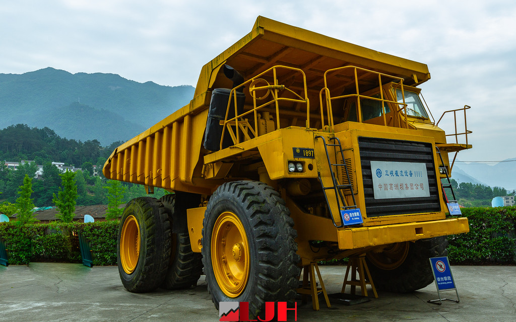 园区内的77吨重的自卸卡车,被漆成工程专用的黄颜色,但看车轮,就比一个人的身高还要高一些。在这中巨大的三峡工程车辆前,每一个人都会觉得自己的渺小。其实,修建三峡工程,完全是一种人与大自然作抗争的力量博弈。