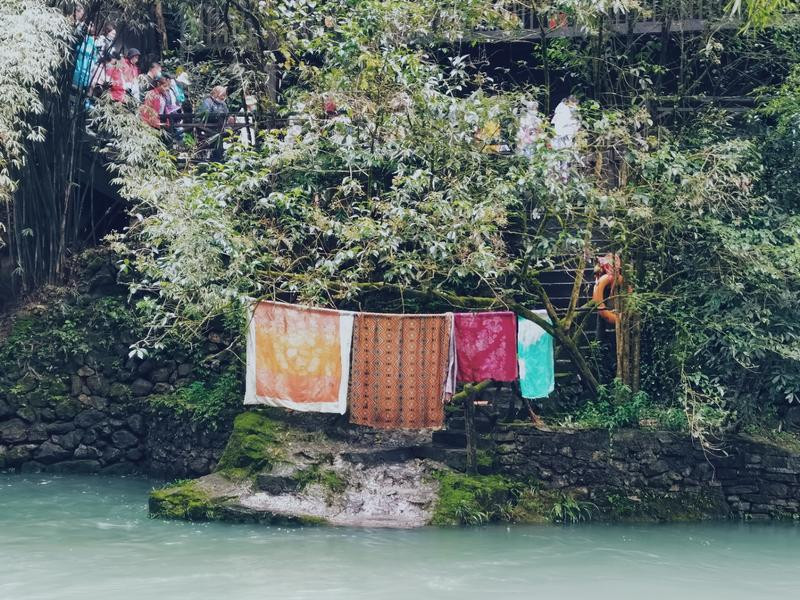 平常在溪边捶打衣服的幺妹,因为下雨也不在,只看到洗完挂好土布做的被单。边洗衣服边唱歌,也是一种别样的情趣。