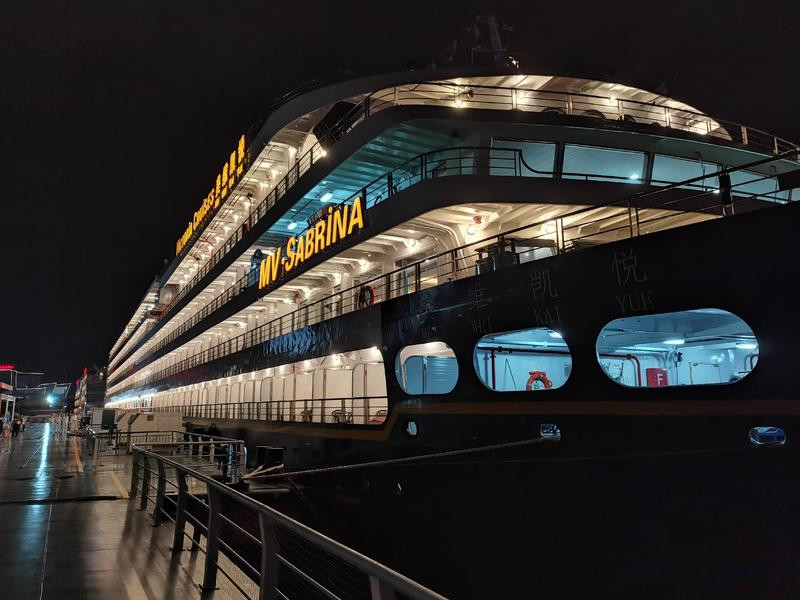 我们这次乘坐的是美维凯悦号游轮,一条刚刚下水的长江超五星游轮,一艘总吨位1、7万吨的大船。