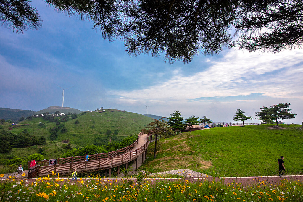 这个季节的百里荒绿草茵茵,鲜花遍地,天蓝云白,气侯凉爽。