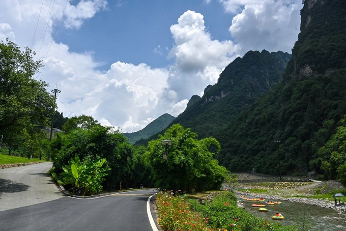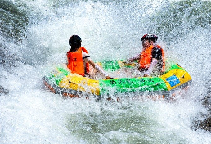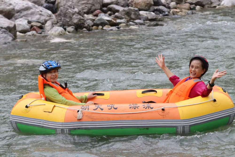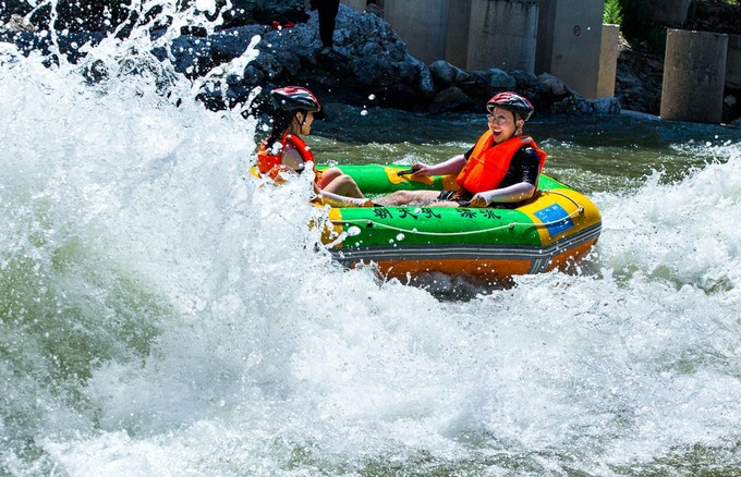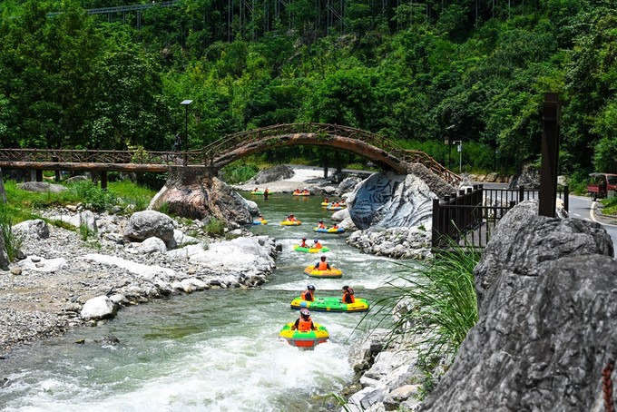 关于漂流玩水,据我所知,目前接待能力在湖北似乎没有更强的了,1天最多接待1万多人。朝天吼漂流,水是自然山间水,奔流于高山峡谷之间,份外清凉,最适宜火热的夏季,最消三伏的暑热。漂流河道位于夏阳河河谷,起于高岚镇,止于两河口。两河口是高岚河与夏阳河的交汇处,全长6.5公里的漂流路程,落差148米,已决定它的惊险刺激。河道经过人工改造,宽窄有度,急缓有序,疏密有方,弯直度既依存河谷本身,又有人为设计,大S型拐弯,Z字型转折数不胜数,60度陡降,也有多处,所以既惊险刺激,也较为安全,遵守景区指导,都会有惊无险,顺利到达终点。漂流皮艇,有时像脱缰的野马,横冲直撞,浪花四溅,波浪甚至劈头盖脸地砸下来,让人猝不及防,很有趣,很清凉,特消暑。有时舒缓悠然,像在公园水上乐园,慢悠悠地闲逛,可以抬头看天上白云飘飞,看两岸青山滴翠,左顾右盼地和友人惬意聊天。朝天吼漂流分日漂和夜漂。日漂是最普遍的了,自驾的话,出高速,放下行李,简单补给就可以开漂。城市公交车808路从宜昌每1刻钟发1班车,2小时直达景区,很方便。自驾选择性更强,如果住到房车营地是很美的,房车营地在起漂点和止漂点中间,办好入住,再把车停到止漂点停车场,然后坐景区观光车到起点,漂流结束起水取车,开车到房车营地住宿,这样安排比较节约时间。房车营地住宿,室内有冰箱、微波炉及厨房用品,可以自己煮食物,过桥到高山草堂进餐也方便。高山草堂的菜品相当不错,推荐宜昌特色菜品抬格子。抬格子是一道杀猪菜,过去只有在宰杀年猪时才可以吃到,在高山草堂可以随点菜。抬格子说白了就是宜昌粉蒸肉。