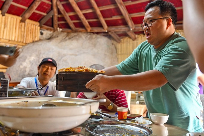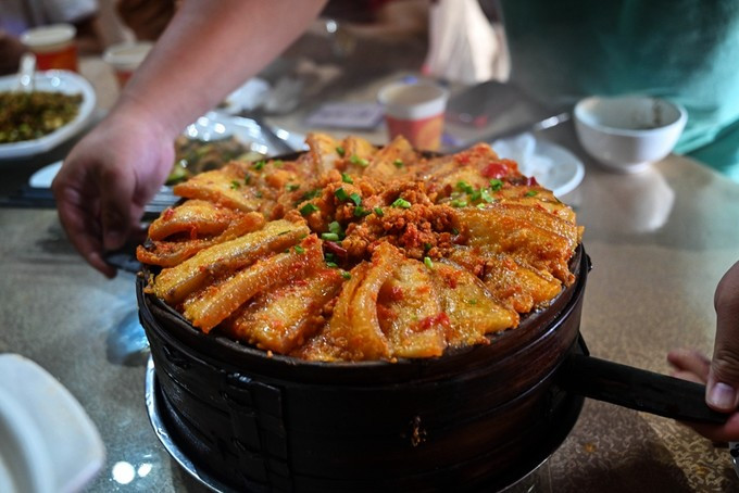 做法和普通粉蒸肉很相似,只是所用蒸肉粉是玉米糁加红辣椒经过发酵叫鲊广椒的一个地方特色菜,咸鲜、酸香,色泽金黄。鲊广椒不仅蒸肉好吃,炒腊肉也是一绝,素炒也很下饭,一定不要错过。