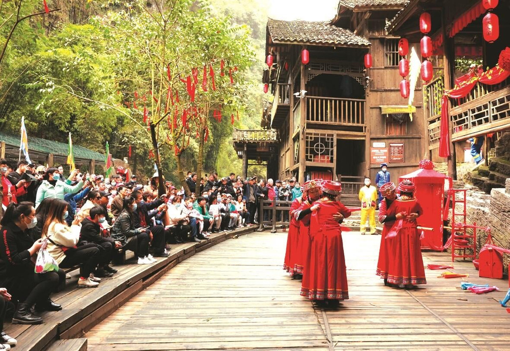 乘坐摆渡船,穿过西陵峡口,可以看到长江上难得一见的古帆船,伴着船工的号子声,在吊脚楼下诉说千年峡江的故事,翠绿的溪水,倒映着乌篷船上的渔家生活,岸边热情好客的土家幺妹像游客打着招呼,横挂两边的岸桥,古色古香,好一副水上人家的画卷,在婚嫁楼可以体验土家族的传统婚假习俗,由土家幺妹抛下绣球,男士们抢到成功,便可以换上服饰完成拜堂成亲的仪式,一场沉浸感十足的体验完成。