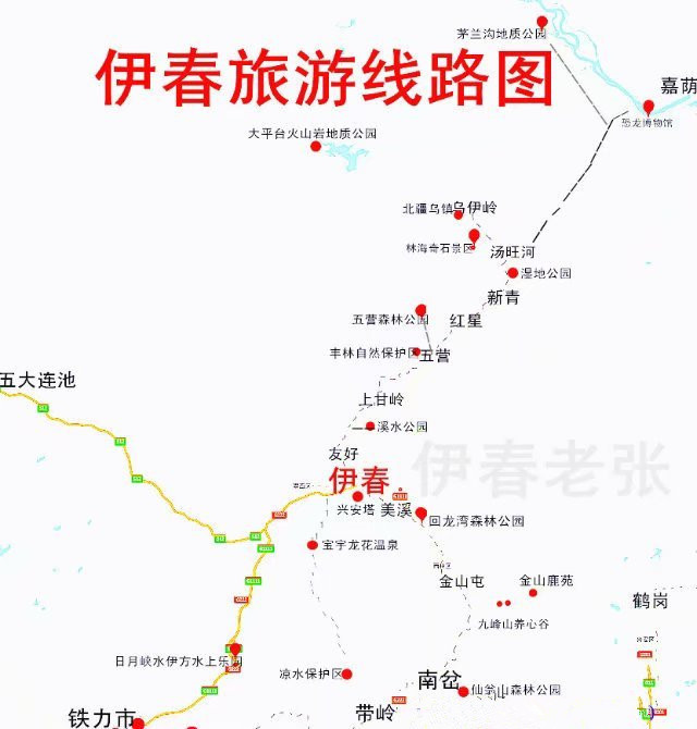 伊春—上甘岭溪水公园—五营森林公园—新青湿地公园—汤旺河国家公园—风灾遗址公园—稻田村分叉左转为<茅兰沟地质公园右转为<恐龙博物馆—嘉荫县城。