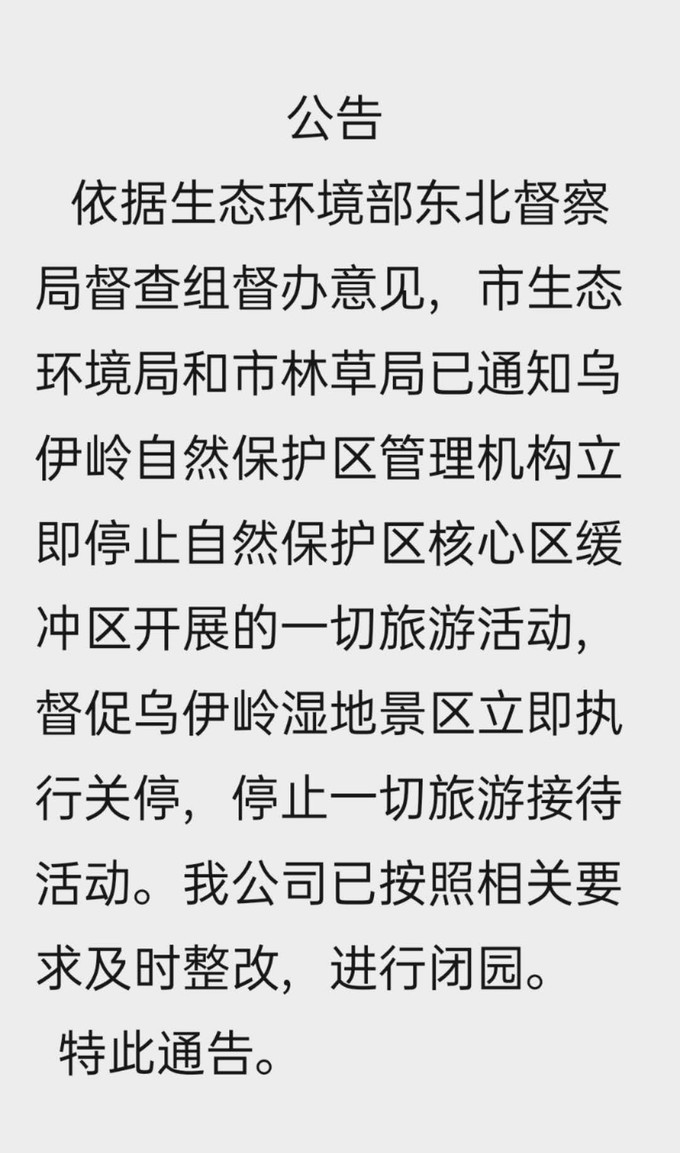 关于景点:除乌伊岭湿地公园关闭中,关闭原因见下图,伊春所有景点都已全部开放,没有变化的景点此攻略我就不一一描述了,有很多热心的旅友写的游记大家都可以参考。