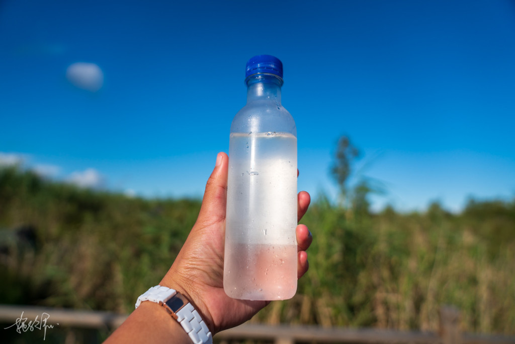 刚刚装入矿泉水瓶里的水呈现像是从冰箱拿出来的水一样,这就是天然的冷泉,它是重碳酸镁钙型水,喝起来略微有一点点铁锈味道,这是带不走的天然矿泉水,来都来了,喝一杯再走。