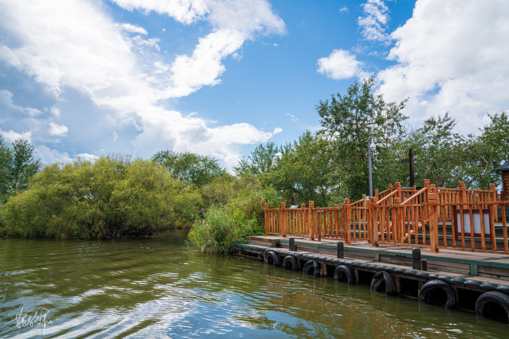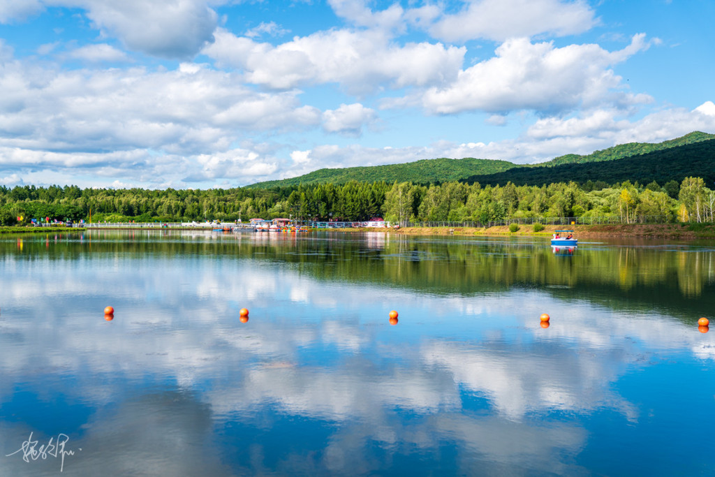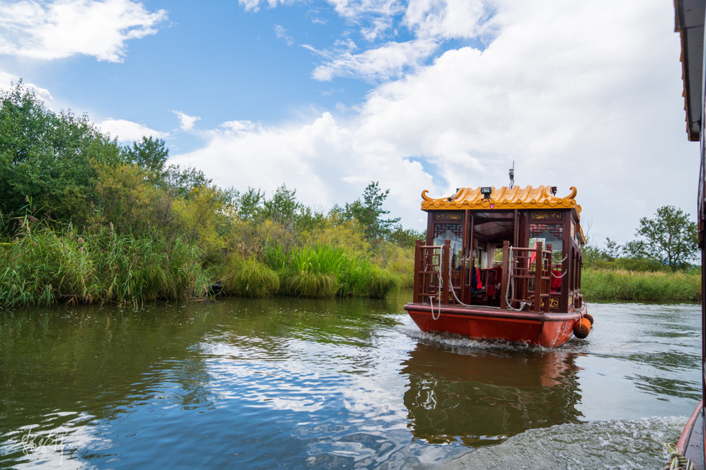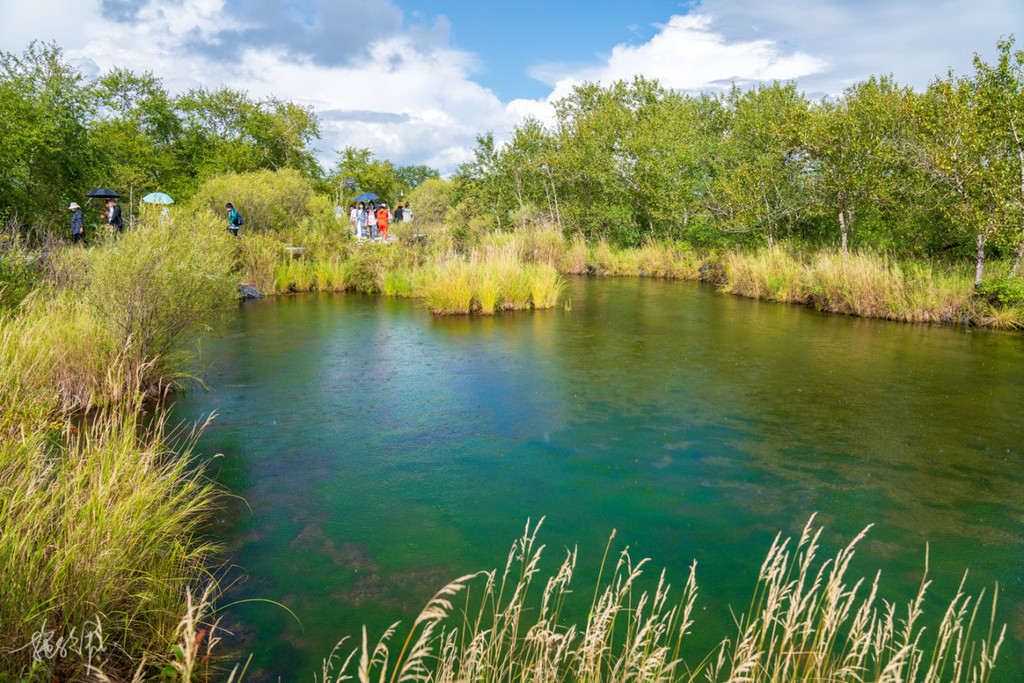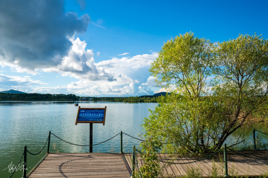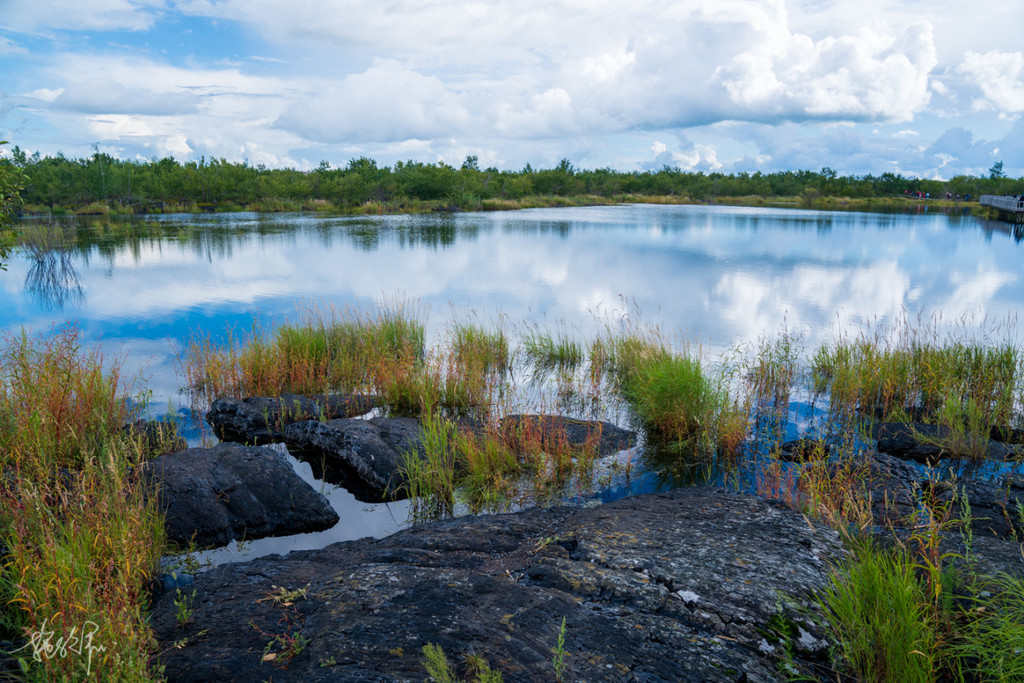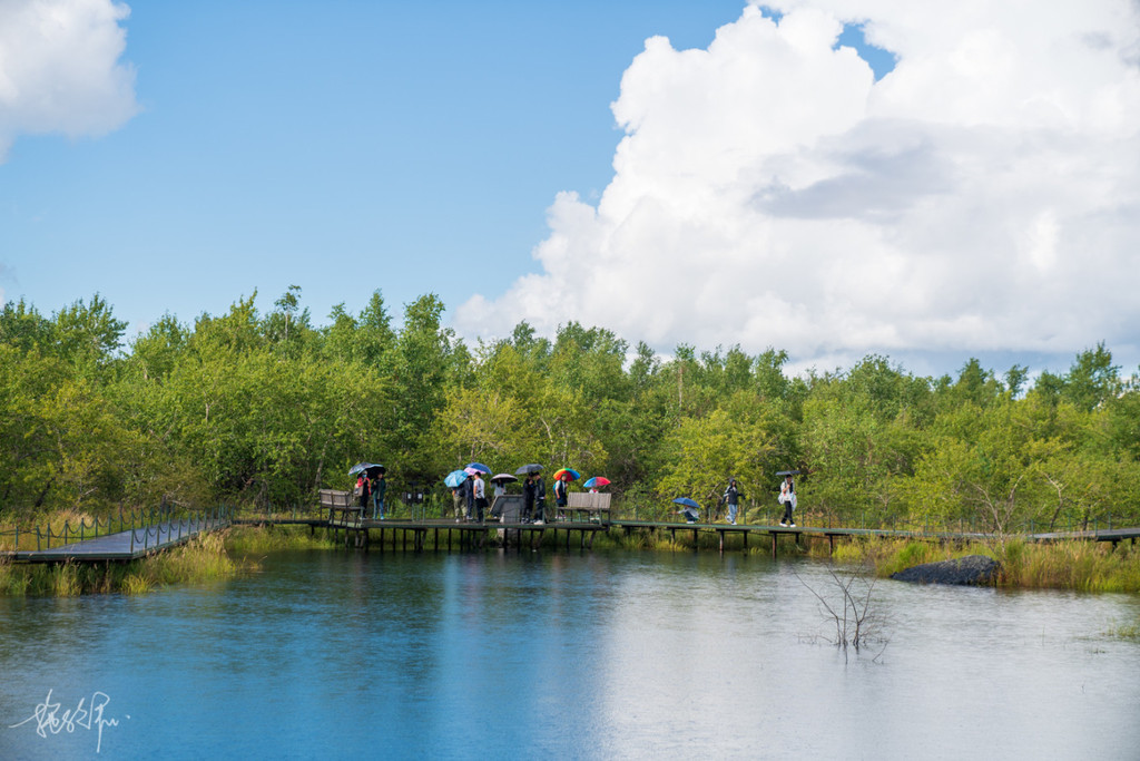 山水相依的温泊,是 五大连池 不能不去的一个景点,被誉为“火山九寨”。我们踏上了前往温泊的游船,船只在石龙河上游荡,蓝天白云倒映在河面上,远处蓝天白云与乌云同时存在,很快便来到了码头。