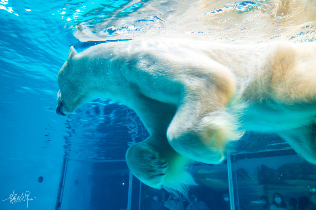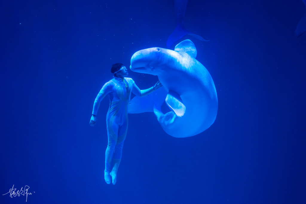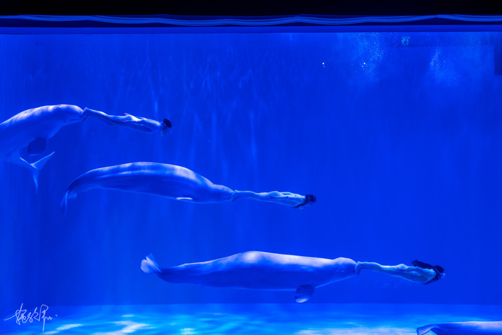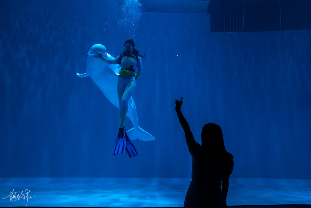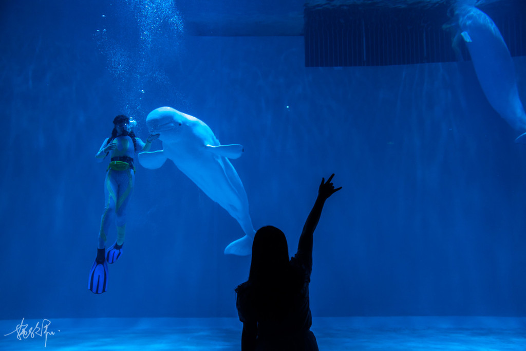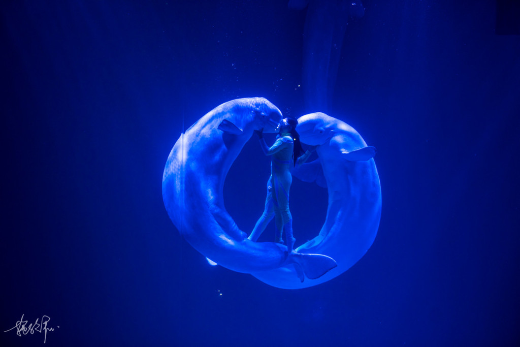 整个极地公园最值得看也是名气最大的是“海洋之心”,是一场轰动了世界的白鲸水下表演秀,这是一个高难度的由两位驯养师与白鲸宝贝一起完成的动作。在一片蓝色的汪洋之中,人与白鲸拥吻,整个画面呈现出心形,看完了这场白鲸秀整个人都被治愈了。