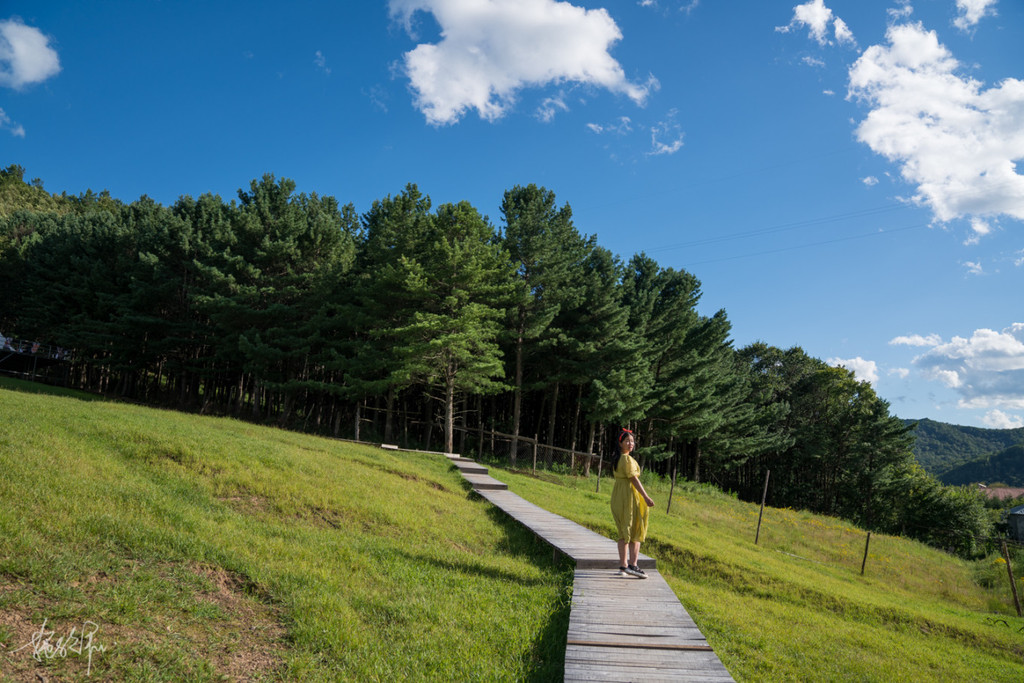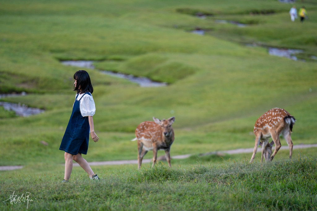 我们到的时间是14:00,小鹿一般16:30开始往山下草坪方向撤回。如果在这之前你想要一睹小鹿的容颜,可以顺着木栈道、溪水一路往山里走去。徒步去山上,你能看到成群结队的小鹿在森林里奔跑,自由自在。