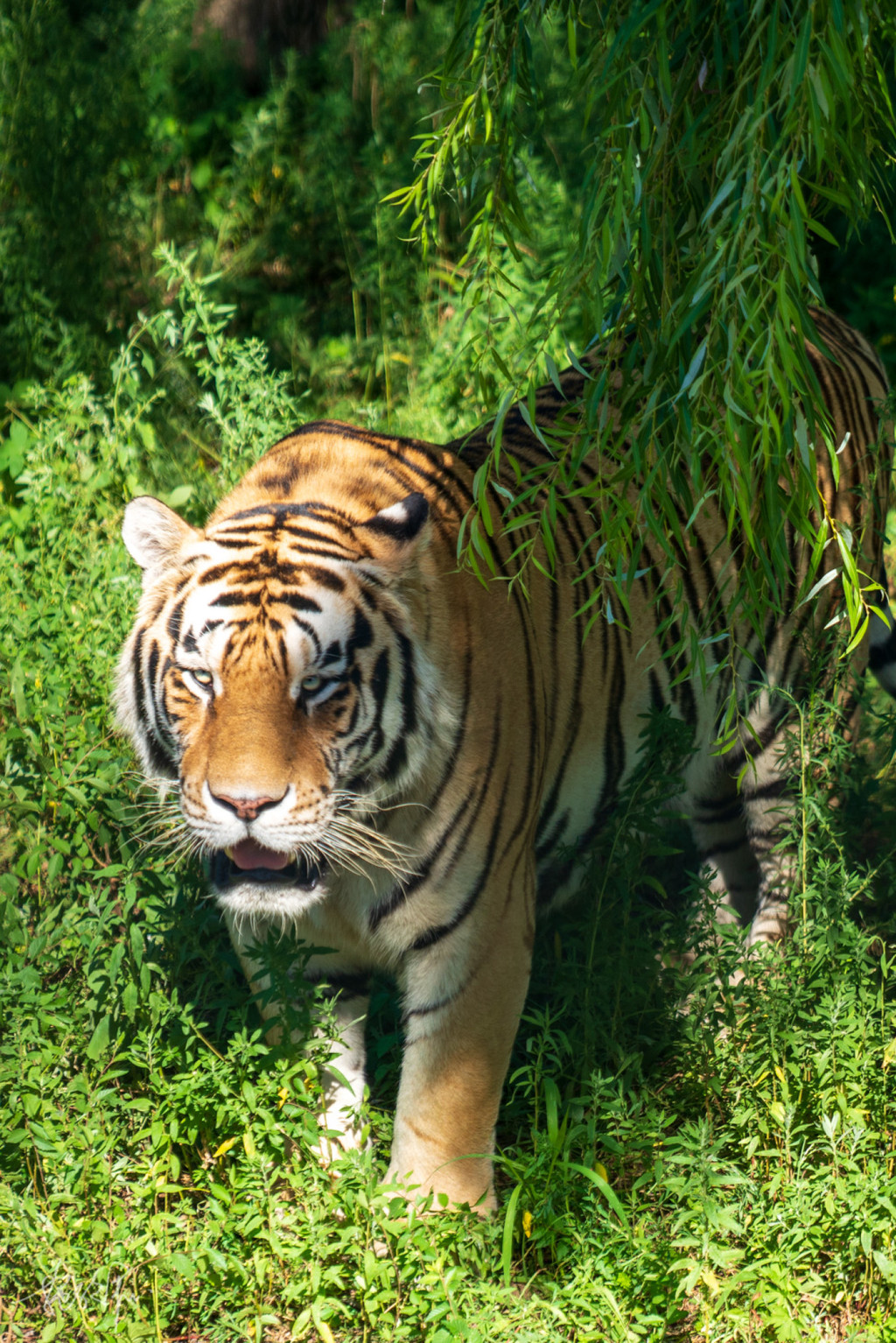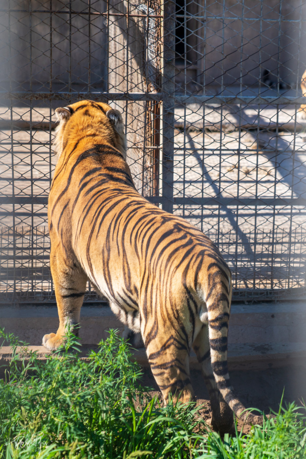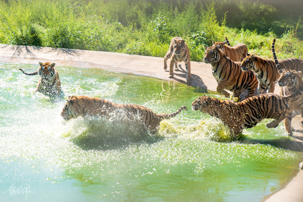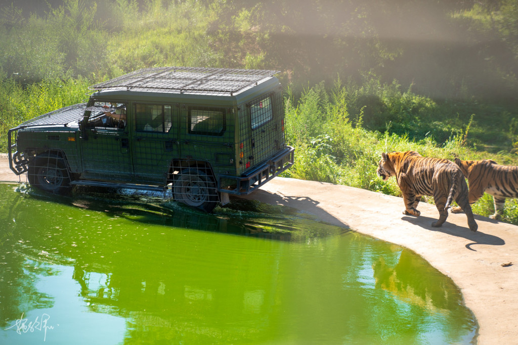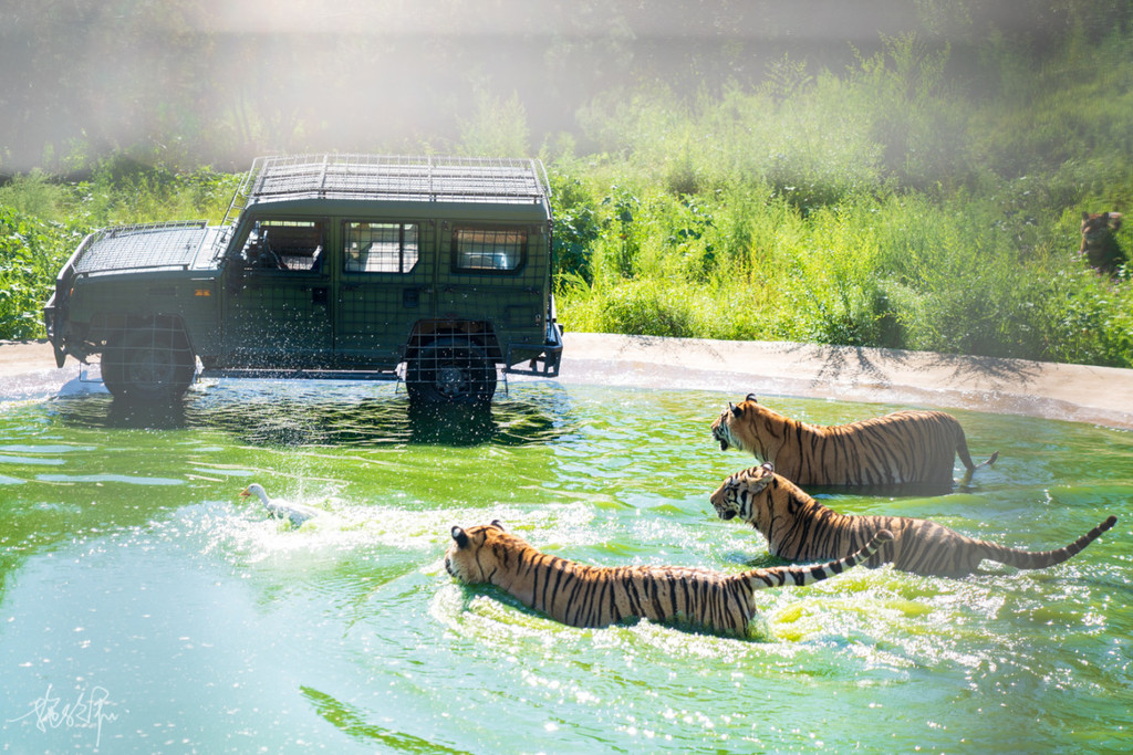 此时来了一辆绿色吉普车,林子里大部分老虎都跟在它身后,日常肯定都是由这辆车给它们带来了美食。我隔着铁丝网,看着老虎们在池子里进行了一场生死争夺,速度非常快,一只强者老虎已经抓到了鸭子。