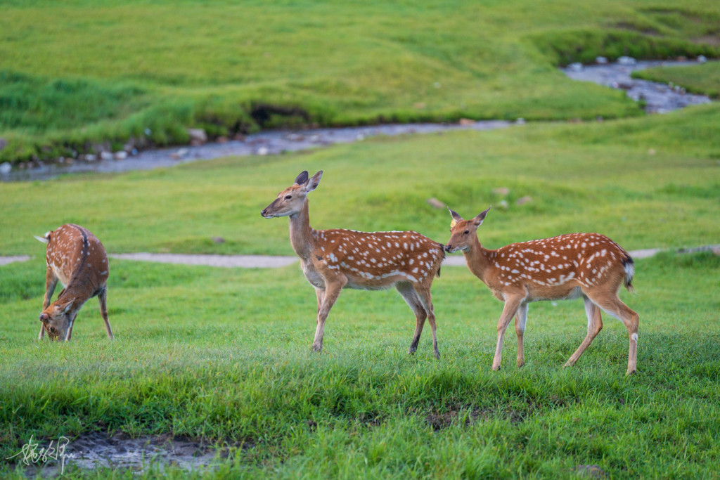 终于等到了山谷里的铃声响起,小鹿们知道是回家的时候了,慢慢地一大批的小鹿下山,漫步在大草原之上,傍晚光线不太好了,还是忍不住拍了许多小鹿的照片留恋。