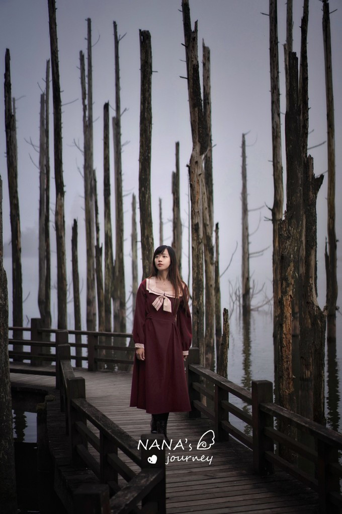 月亮湖的一侧有一片挺拔的水杉树干,直插湖底,因为上面没有绿色叶子了,所以看上去有一点荒凉。而恰恰是这份荒凉,配上点雾气,仿佛迷雾森林一般,充满神秘色彩。