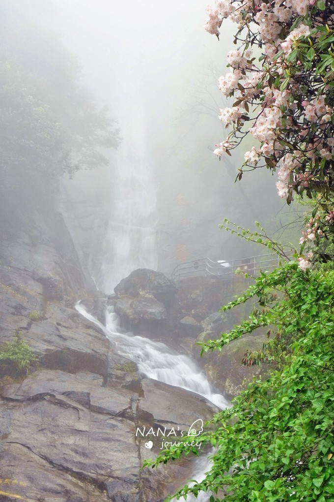 山间杜鹃花和瀑布是绝配,若不是雾气太重,一定美的让人心醉。