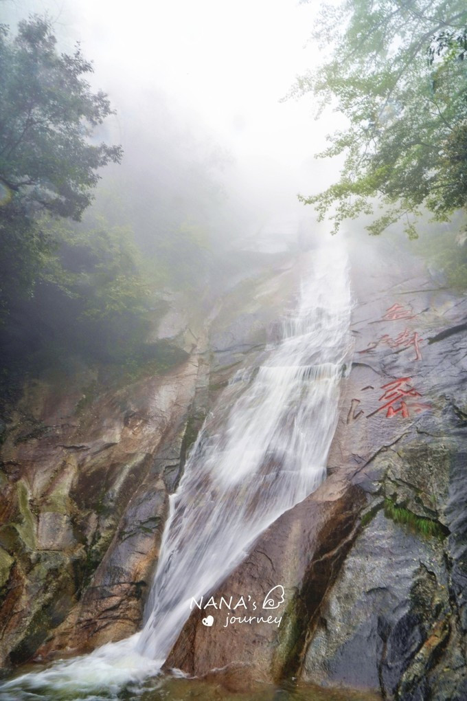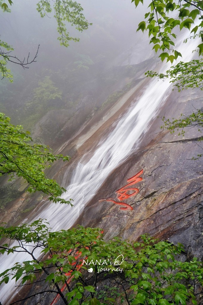 一大块完整的山壁,任由瀑布的洗刷和流淌,变得更为光洁,这就是鱼鳞瀑,走的最平直的瀑布。
