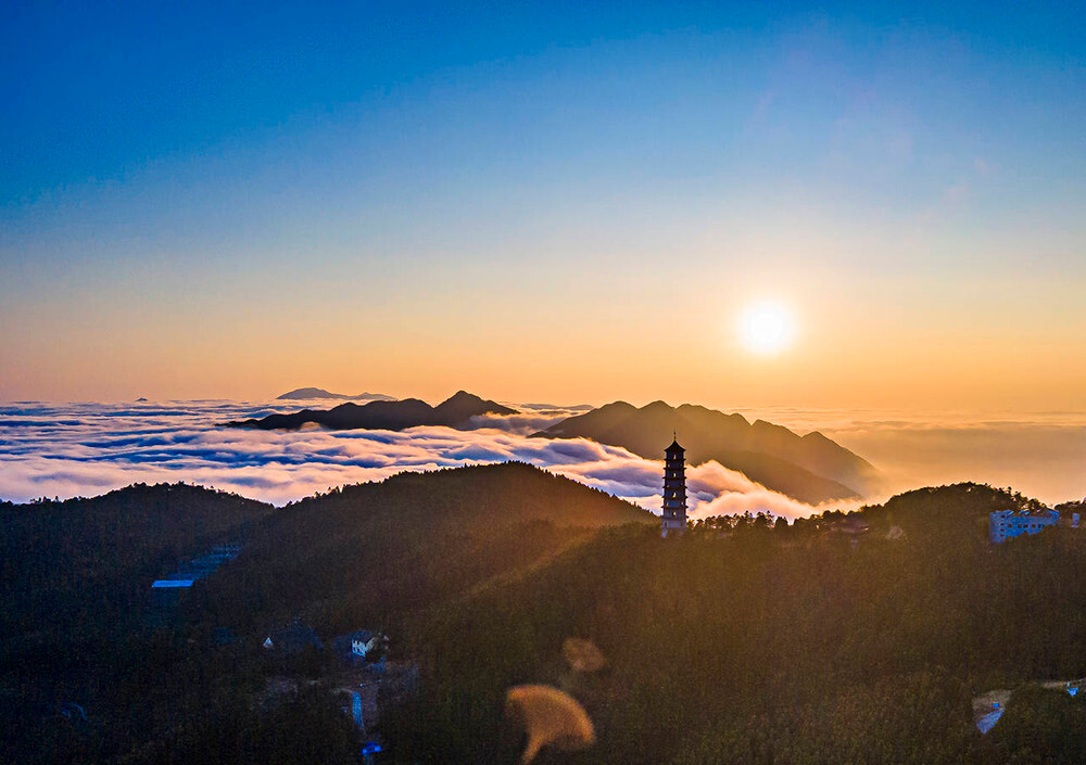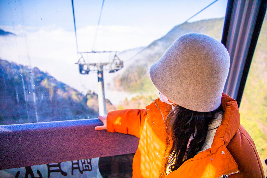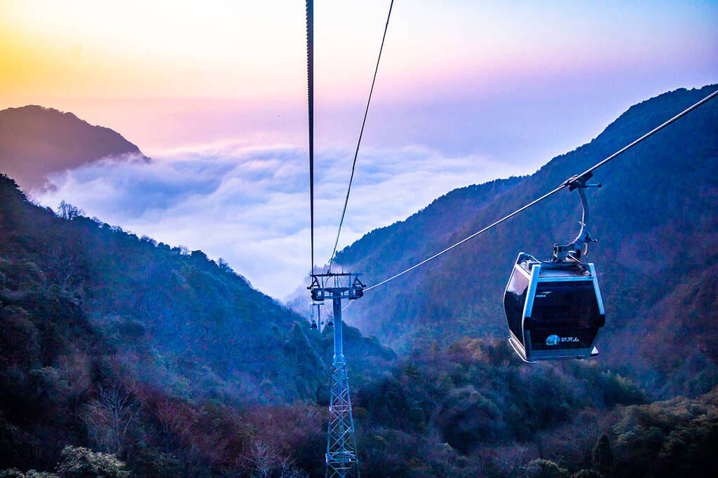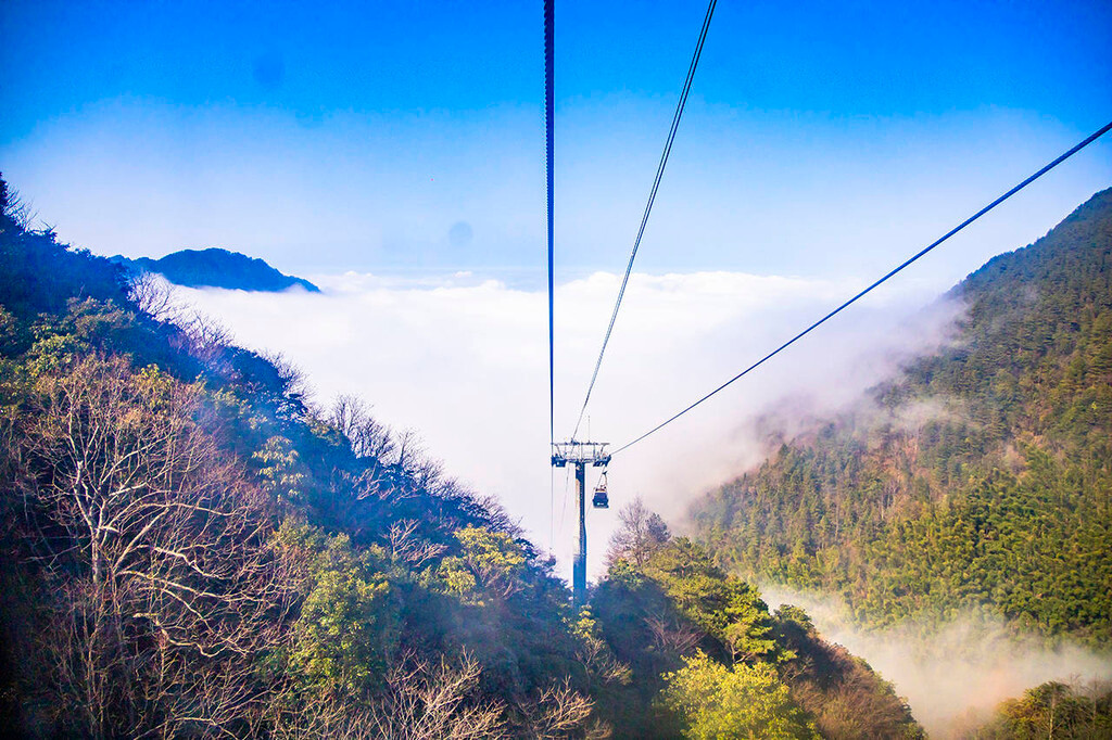 从明月山脚下乘坐观光缆车,直达海拔1600米的山顶,一路欣赏沿途山色。乘缆车上行,体验的是穿云的快感,越临近山顶,云海的迷雾也愈发稀薄。明媚的山脉,头顶的蓝天白云露出了真容,郁郁葱葱的树木、明月山的轮廓也变得清晰起来。