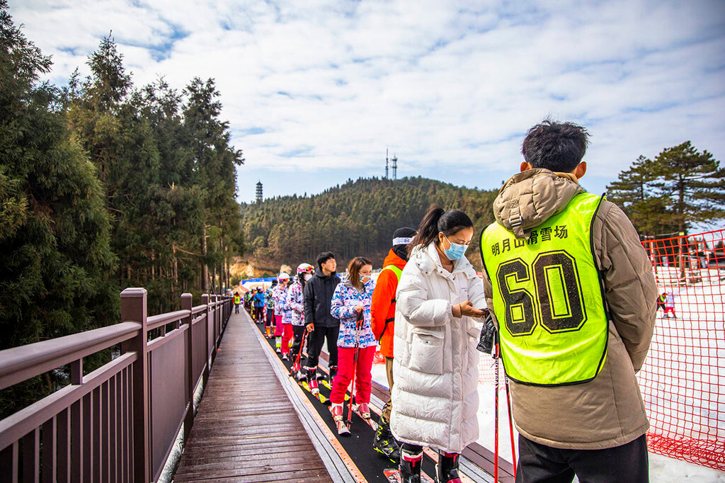 明月山滑雪体验中心,位于明月山旅游区缆车上站。到达明月山旅游区后,前往景区售票窗口处兑换雪季套票。可步行或乘坐观光车至明月山旅游区索道