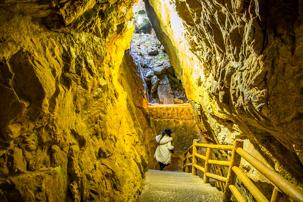 从星月洞出来沿着悬崖峭壁的栈道走,这里就是1700米的青云栈道,可见其横挂在乌云崖绝壁之上,观者有"横空出世"之气势,行者有平步青云之感触,故名"青云栈道"。