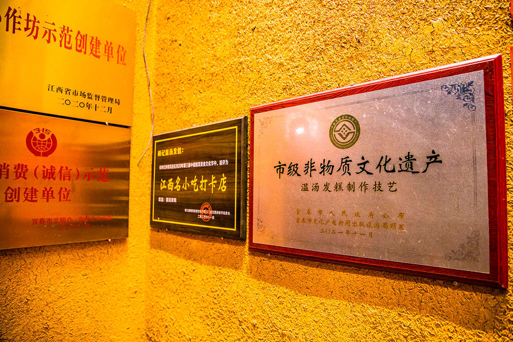 网红美食温汤发糕,是明月山当地传统结婚、寿酒宴席回礼的特殊糕点食品。尝一块刚做好的温汤发糕,刚出炉还带着浓郁的黑芝麻与猪油的香味,闻之鲜香扑鼻、食之甜而不腻、糯而不沾,是当之无愧的明月山网红小吃。