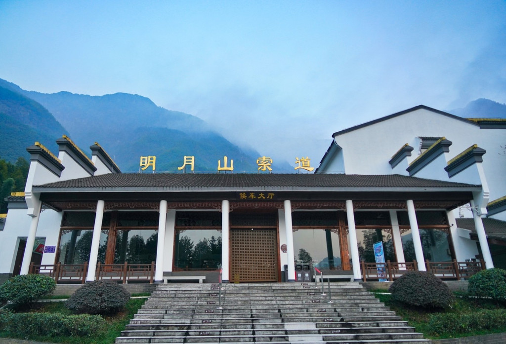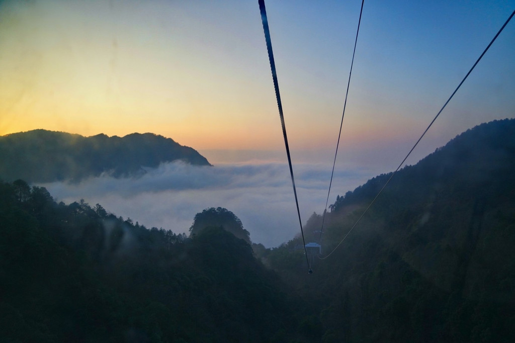 从明月山园区入口而进,穿过竹海幽径,抵达明月山索道站。乘坐索道缓缓上行,破云霞而出,山色明朗,风景如画。