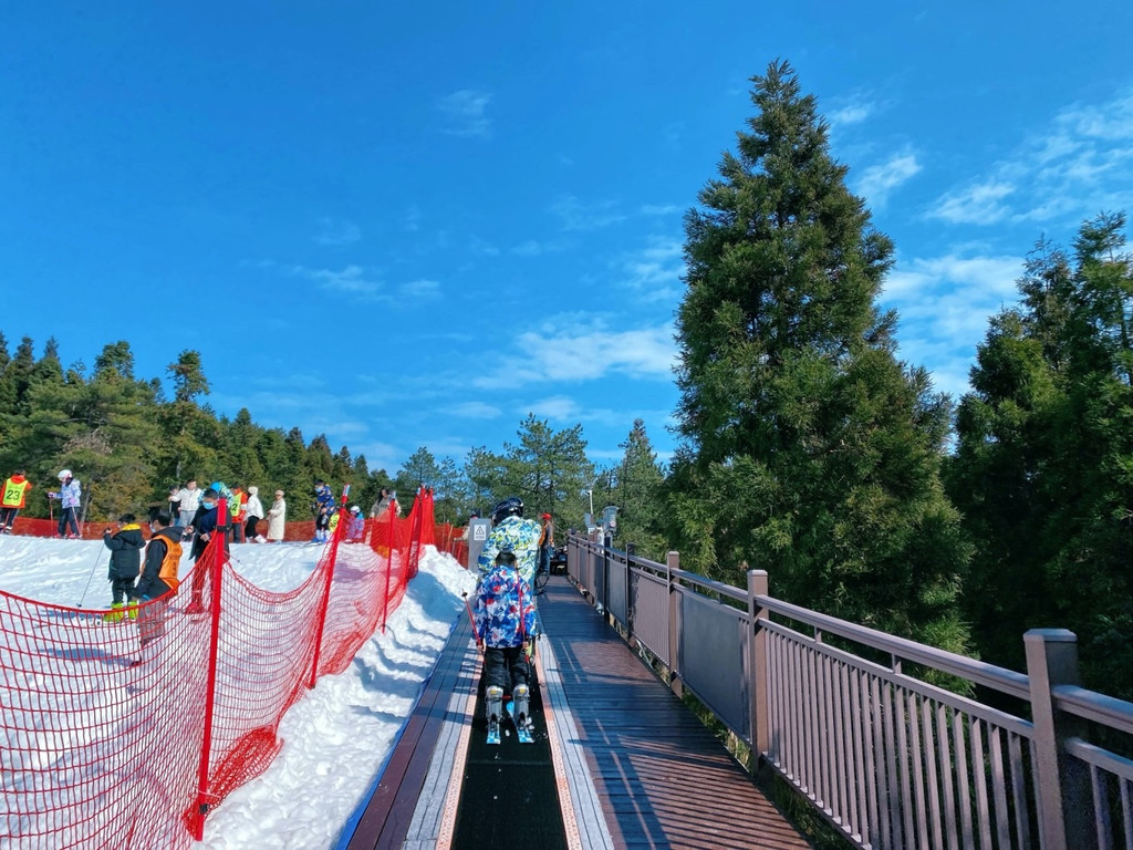 经过两段索道的运行,约20分钟左右,即可抵达明月山山顶。在索道站出口一侧,就是明月山的滑雪场。远处是崇山峻岭的屏障,耳边是林海松涛的自然曼妙之音,驰骋雪场,感受速度与激情。