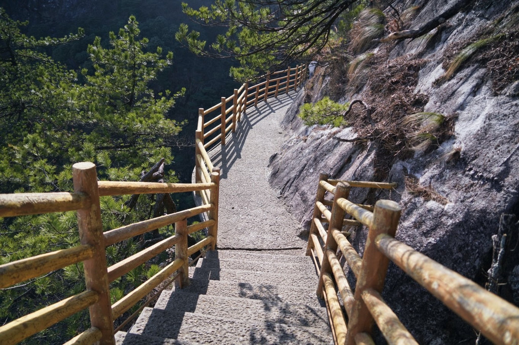 紧接着沿着上上下下的悬崖栈道前行,“绝壁惊人、怪石争奇、苍松都艳、山花织锦”明月山四绝,通通可以见到。