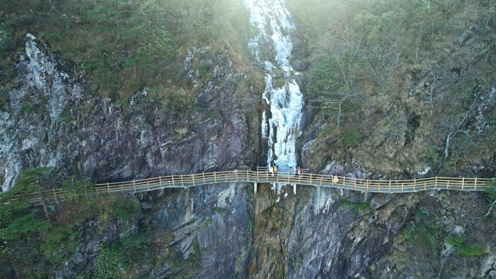 青云栈道长约3100米左右,栈道悬空修建在悬崖绝壁之上,犹如盘龙横卧山间。崖壁上,有形态万千的迎客松,还有洁白的倒挂冰瀑,二者点缀之下,成就了一幅有灵气的山水画卷。