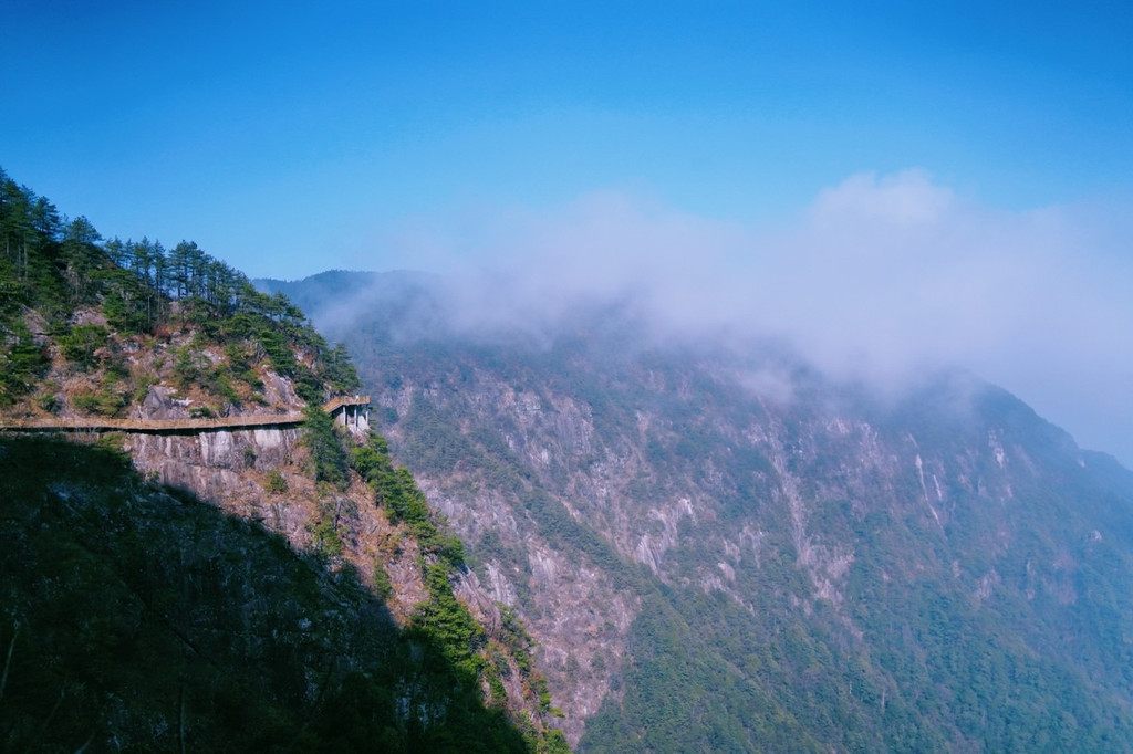 想看明月山的精华美景,就要走一走青云栈道。从山顶的梦月山庄出发,一路下行,穿过150米长的天然岩洞“星月洞”,可观奇秀的明月山峡谷,一侧就是赫赫有名的“青云栈道”。