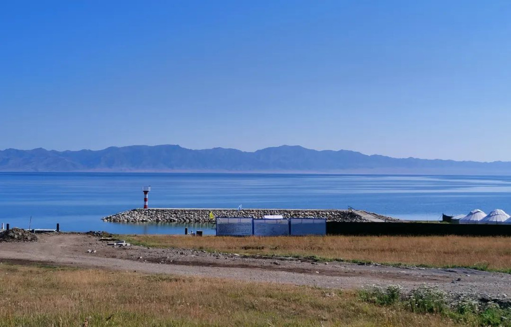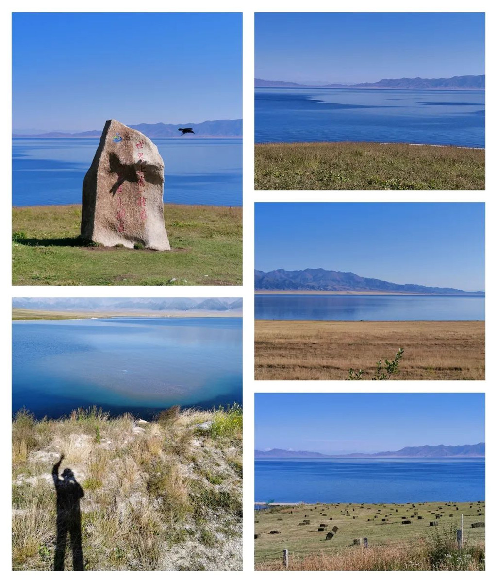 观景台上立着一块石头,上书“世界上有一种蓝,叫赛里木湖蓝”,遥望远处湖面,果然是一种与众不同的蓝:明净而饱和,浓郁而清爽,波纹画出深浅的层次,宛如风在湖面作画。