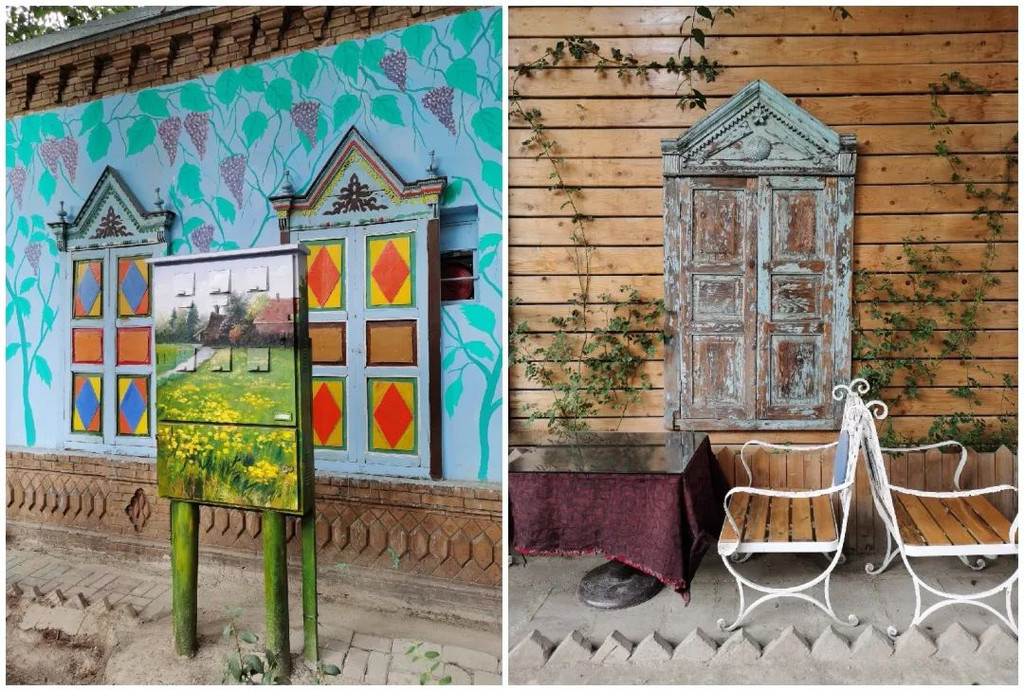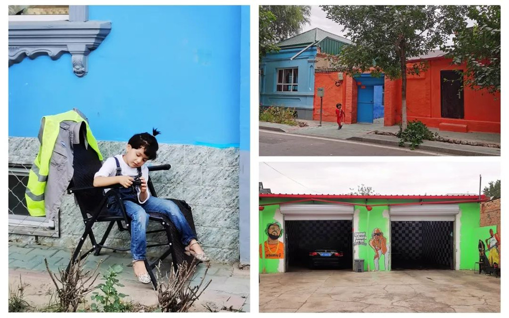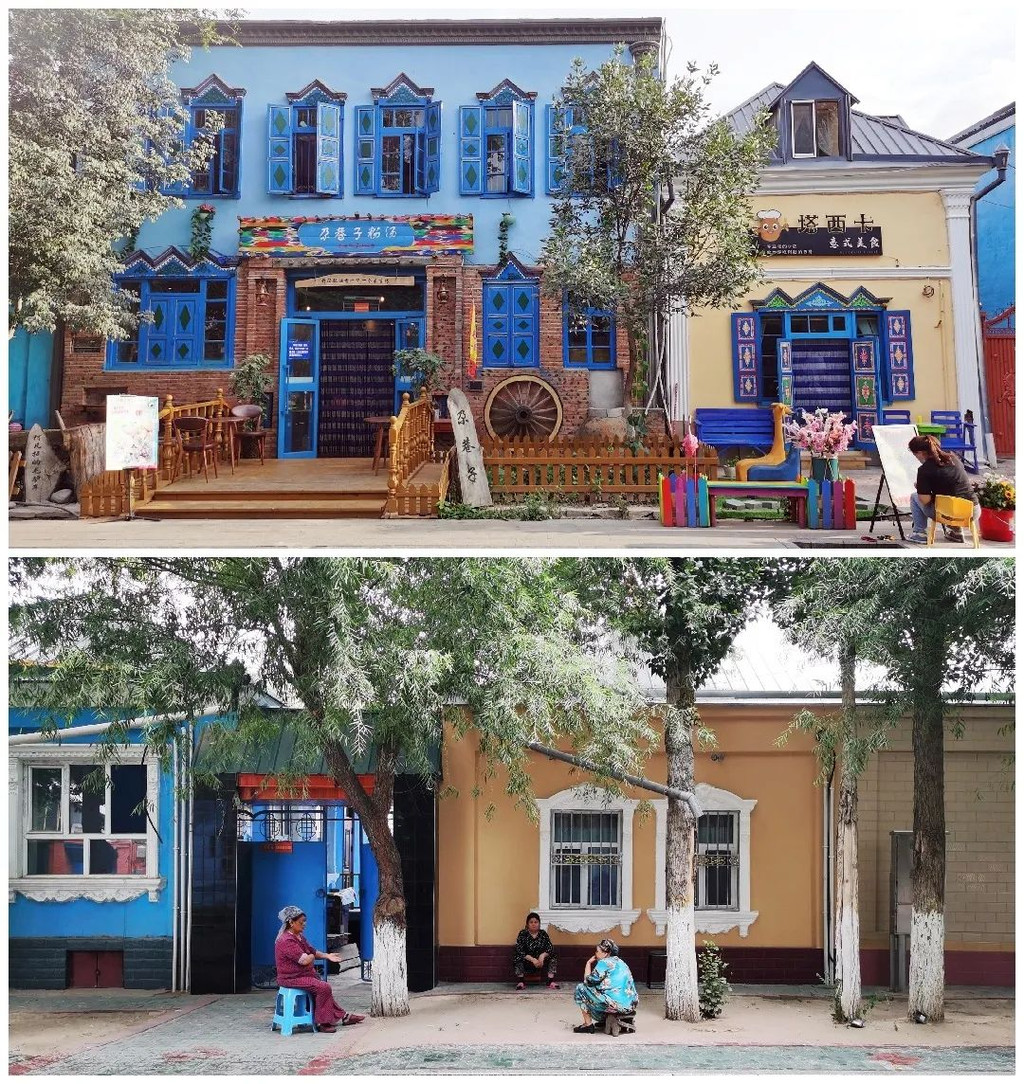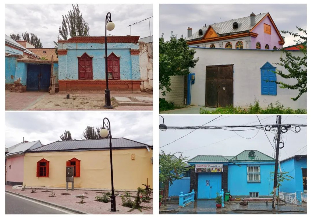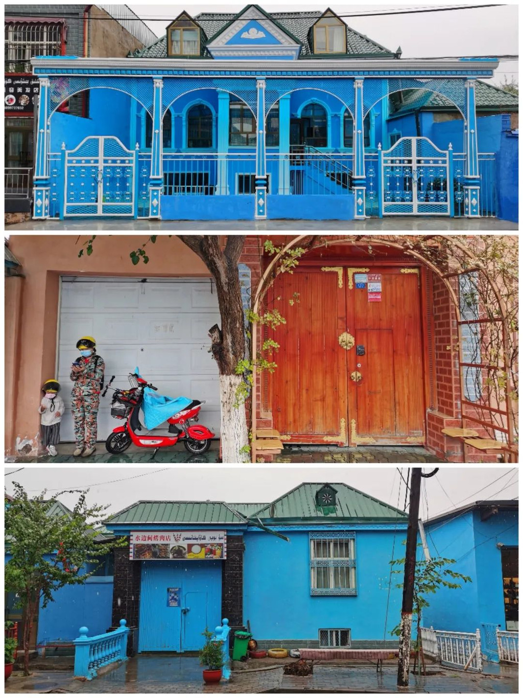 六星街的建筑五彩斑斓,形态各异:维吾尔族民居有着弯形的拱门,门前种着桑树;回族人家院里栽种的树常探出围墙,门窗上有好看的渐变色门帘和窗帘;俄罗斯族的房屋则有尖顶和高台......