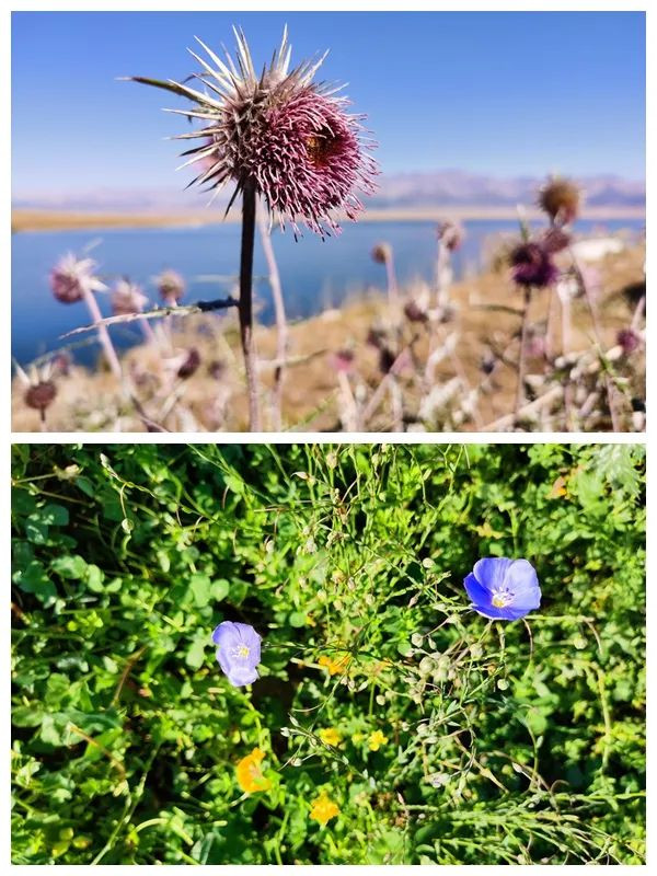 沿湖栈道前行不久是金花紫卉景点,春末夏初时,环绕湛蓝湖水,金黄色的阿尔泰毛茛铺满湖畔至山脚下的草场,随后紫色的假报春花又竞相绽放,宛若花毡,金色与紫色交织,故名“金花紫卉”。