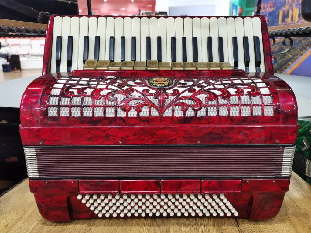 鄙人小时候就拉过几年手风琴,拉的是如下图所示的键盘式手风琴,这是一种于十九世纪六十年代改良过的手风琴,大家日常见到的手风琴应该都是这种。更早期的手风琴为键钮式手风琴,又叫巴扬琴,经历过全音阶、半音阶、有无背带等的改进,巴扬琴的左右手都是按钮,可能大多数人习惯钢琴键盘的原因,直到键盘式手风琴的出现,这种乐器才开始风靡全球。不得不说,手风琴独特的音色在演奏俄罗斯民歌时非常有味道,不信?去听听手风琴演奏的《喀秋莎》、《莫斯科郊外的晚上》和《白桦林》。