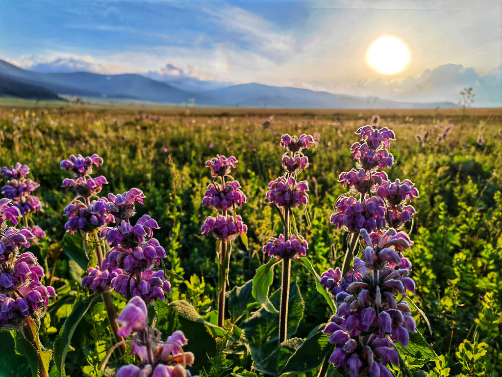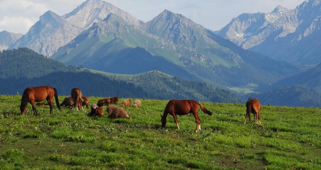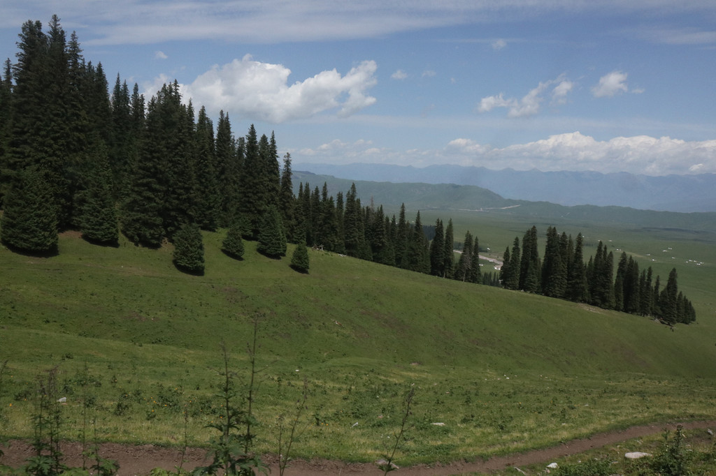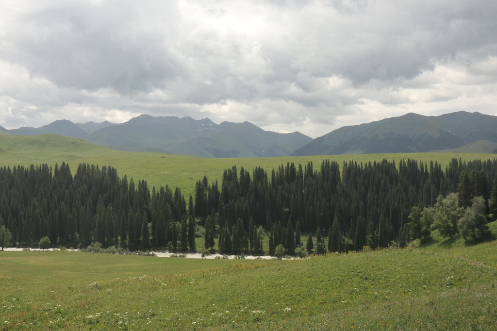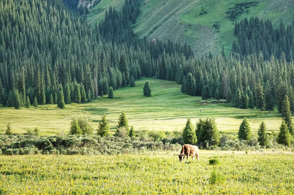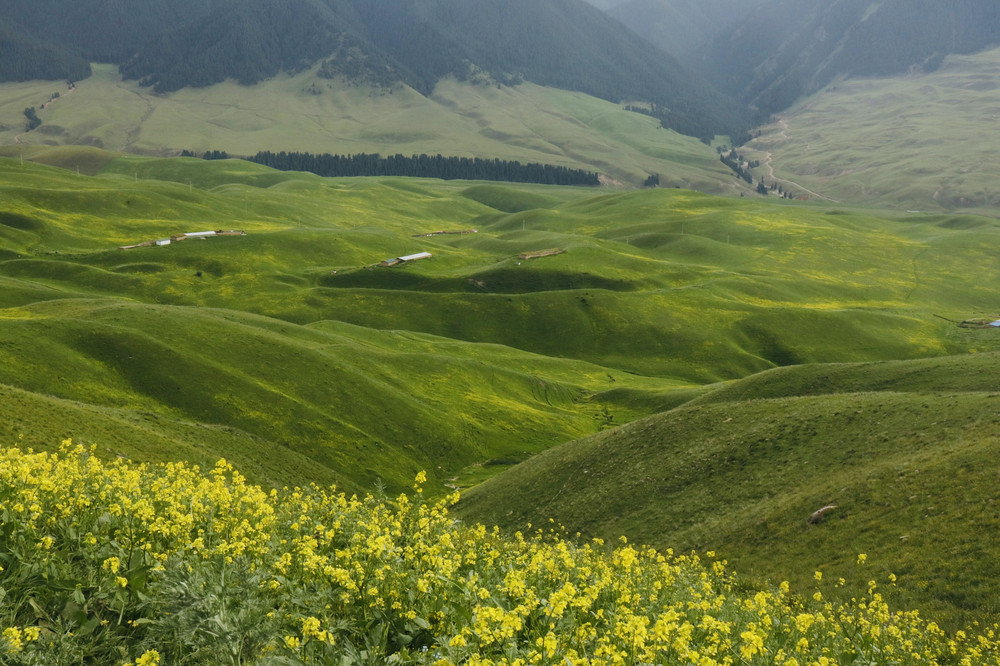 去琮库什台的路上,风景如画。特克斯的小瑞士,各种野花像地毯一样廷伸到我视线的尽头。波浪起伏的草原如湧动的波涛。