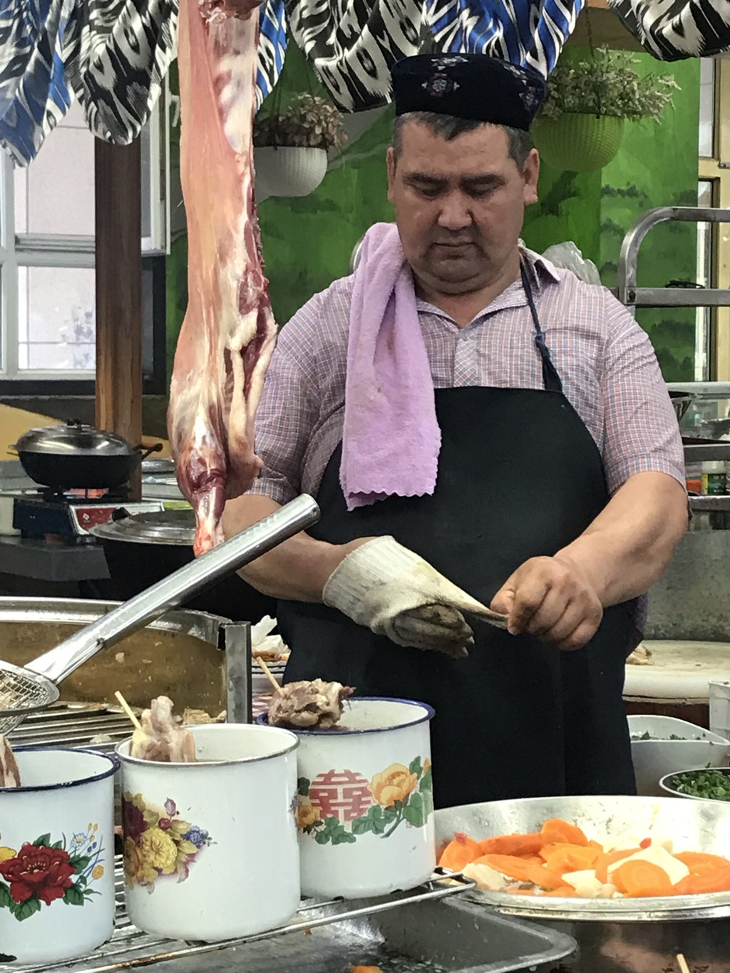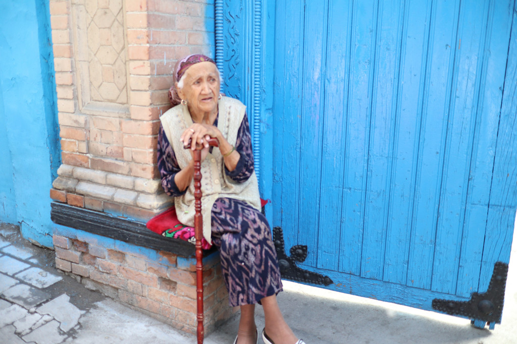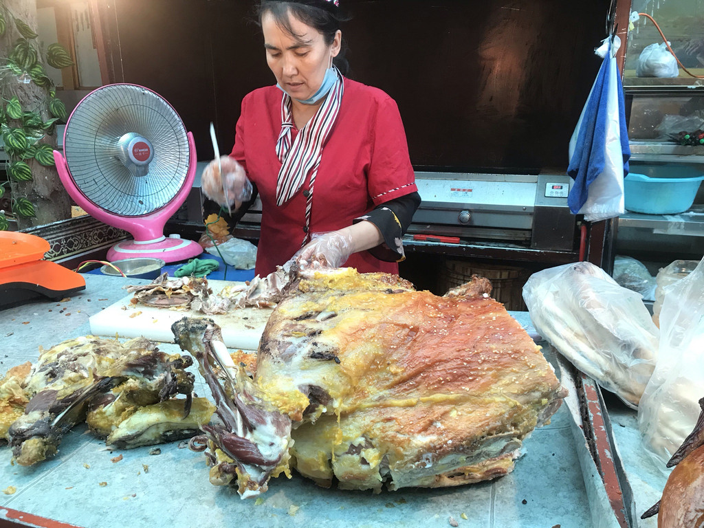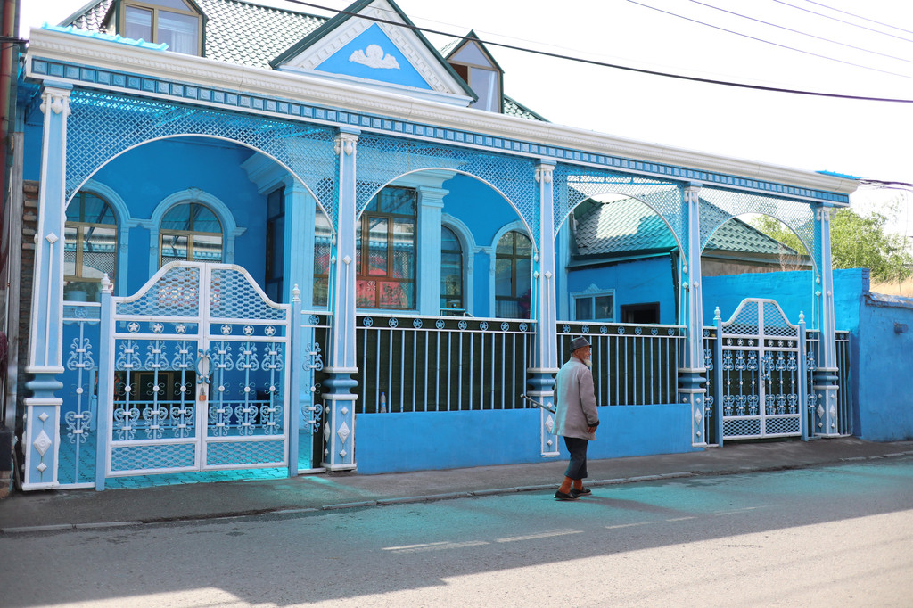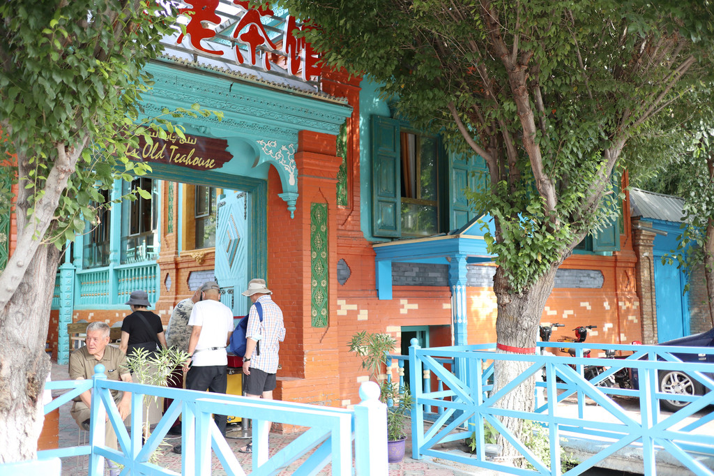 早上的喀赞其人不多,街道干净整洁,两边的吊杏村偶尔落下几颗熟透的杏子,捡起偿了偿,甘甜可口。阳光透过树叶落在安静的老茶馆墙上,斑驳的光影不停的摇曳。继续往前是蓝墙白顶的