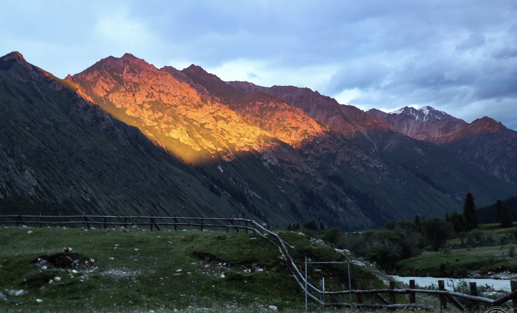 琼库什台依旧是依山傍水,依旧是炊烟下的小木房,但木屋已经变成了民宿、饭店、小超市。村口是几个穿着民族服装的小姐姐在商演。我徒增伤感,联想到了完全商业化的丽江古城。我们匆匆拍了几下就走了,去赶拍落日余晖下的毡房。