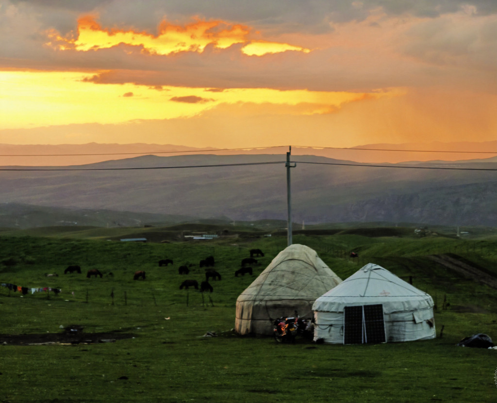 在太阳下山之前我们赶到了山顶,拍下了余晖下的毡房。充满着人间最美好的烟火