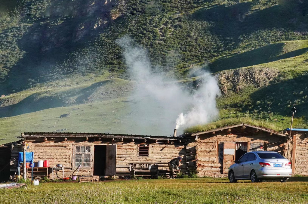夏塔的区间车只能到将军桥。从将军桥到古冰川有27公里,再往前走就是无人区。我们晚上约好了一个司机第二早上6点送我们到将军,(区间车10点钟才开免费)。夏塔古道温差太大。早上实在太冷,在海拔三千多的地方,为了不影响后续旅行我们放弃了。打电话给师傅取消。本以为他会收取点费用,结果分文不取。透过清晨的阳光,看见远处的牧民家里升起缕缕炊烟!这个一日三餐四季的日子在那都一样。