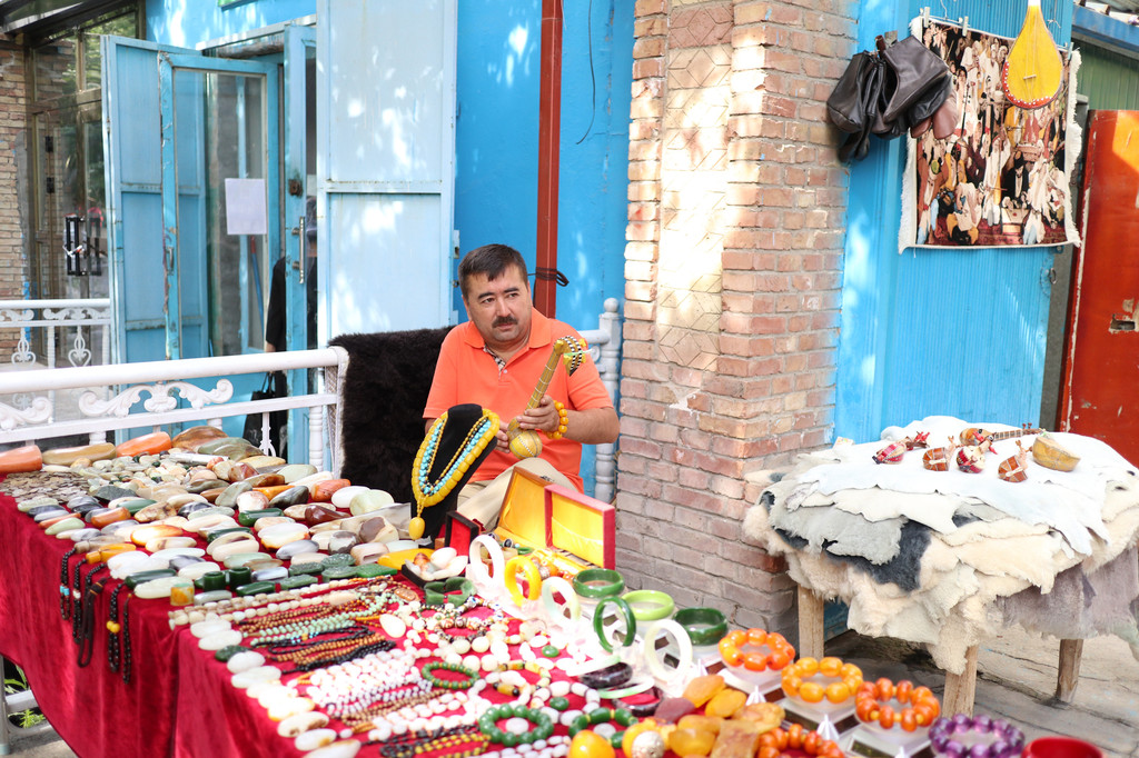 一阵清风吹來夹杂着人鼎汇集的声音,前面有人出來摆摊了,琳琅滿目的各種工艺品,老板悠然的在弾着迷你冬不拉,似乎对到來的客人沒有多少熱情。