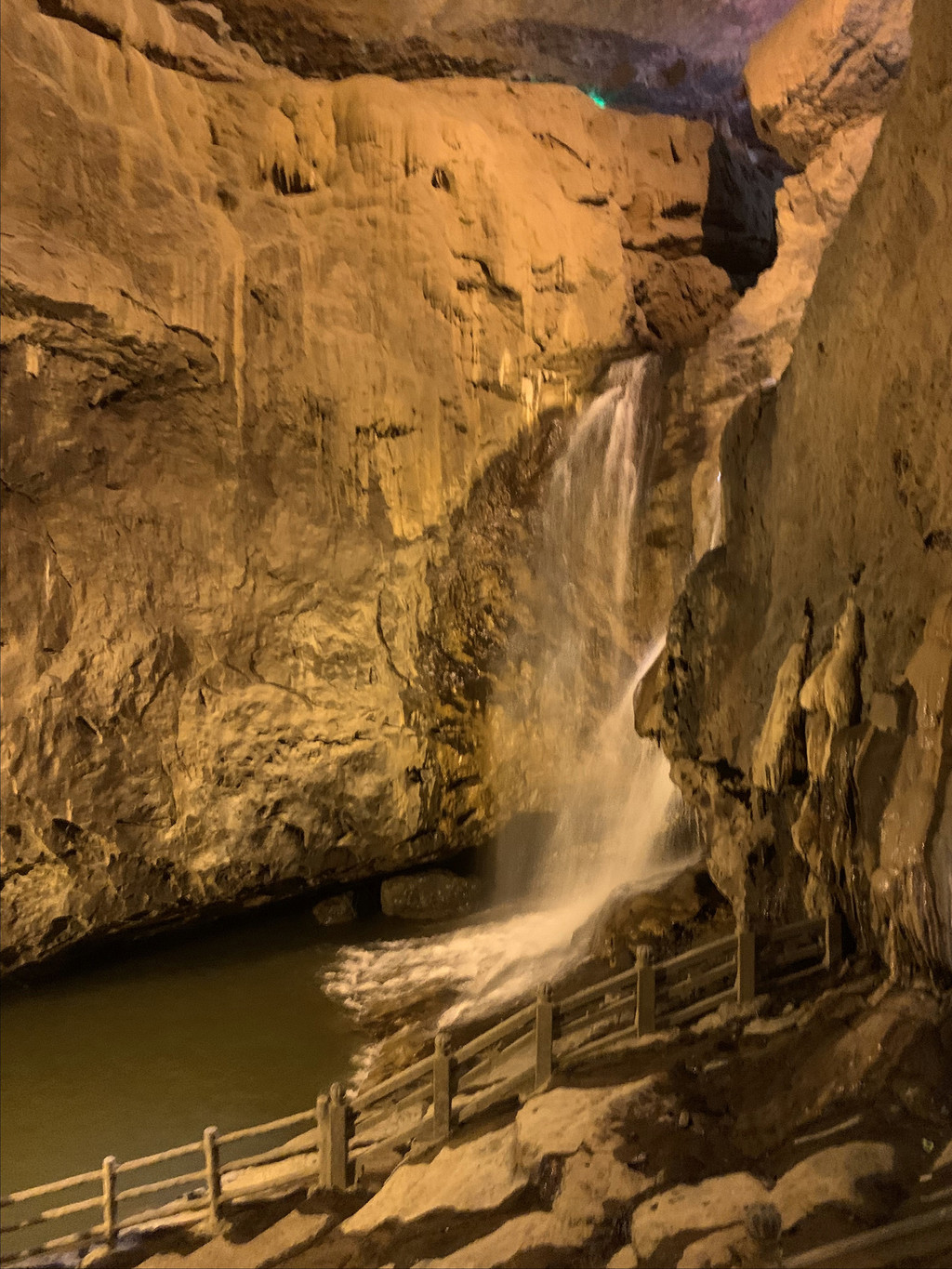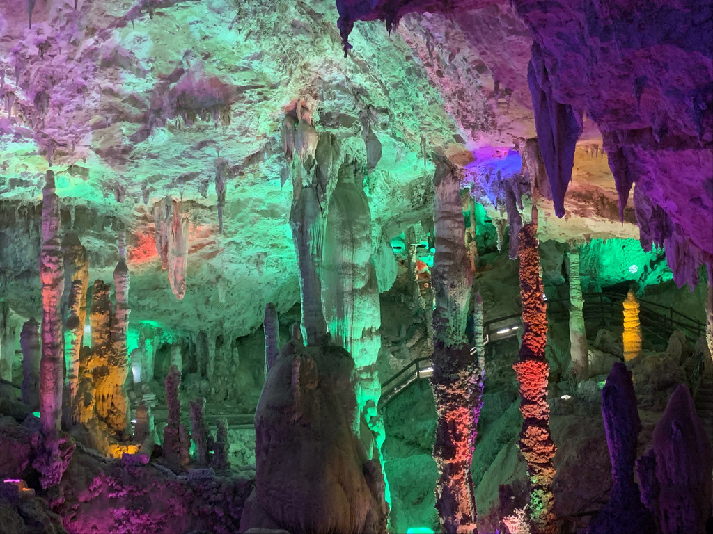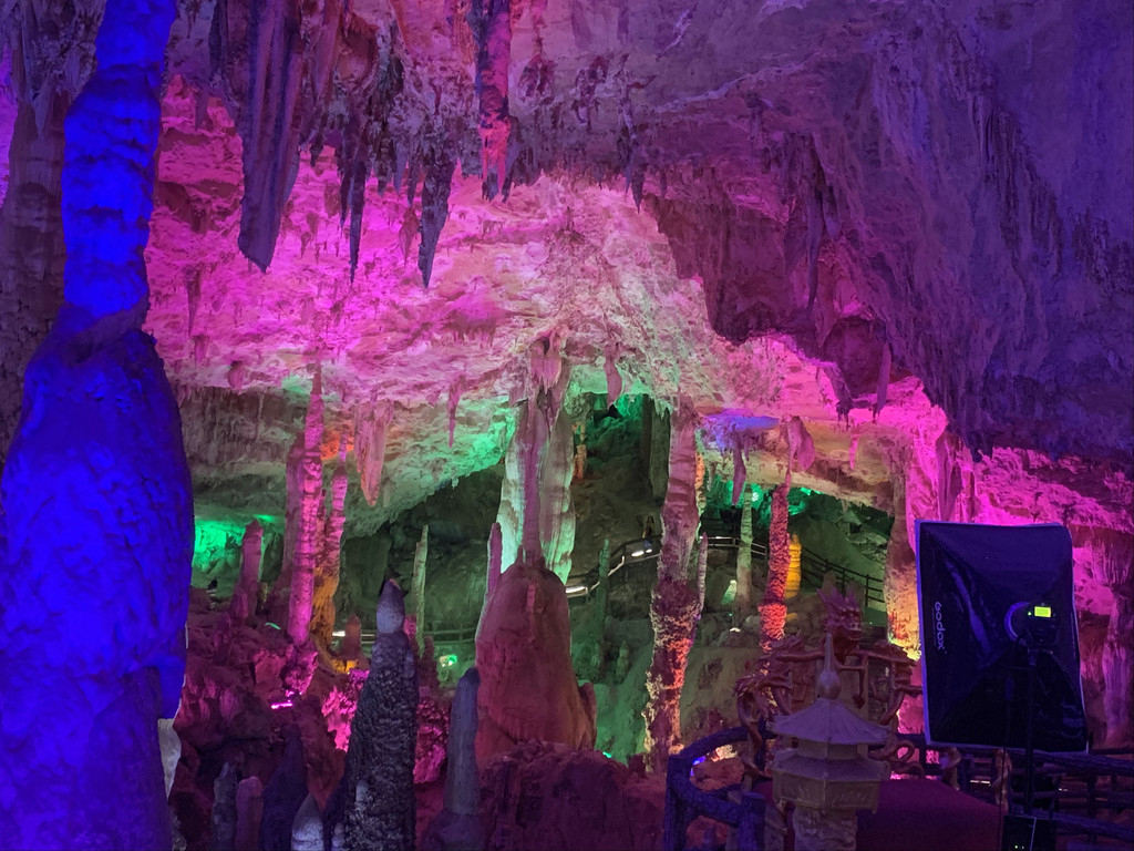 洞内密布的钟乳石千姿百态,在五彩灯光的映衬下,缥缈迷离。走过暗河上的叠虹桥,进到卧龙洞。