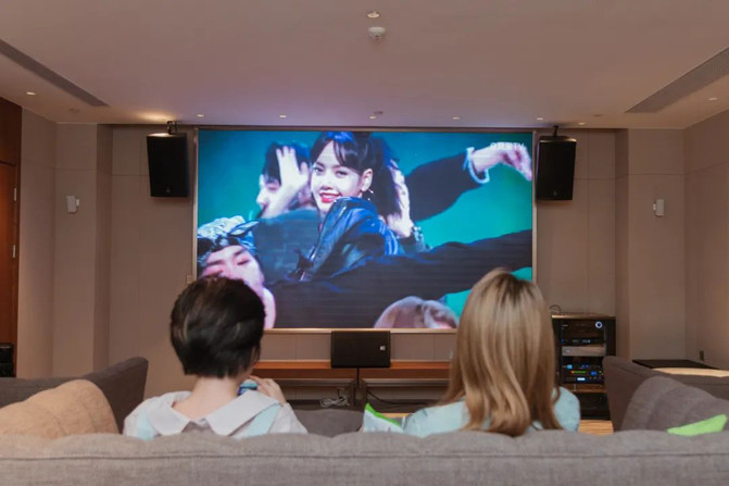 带上闺蜜来到私人影院,相互依靠地坐在沙发上,吃着小零食,完全沉浸在荧幕的故事情节里。