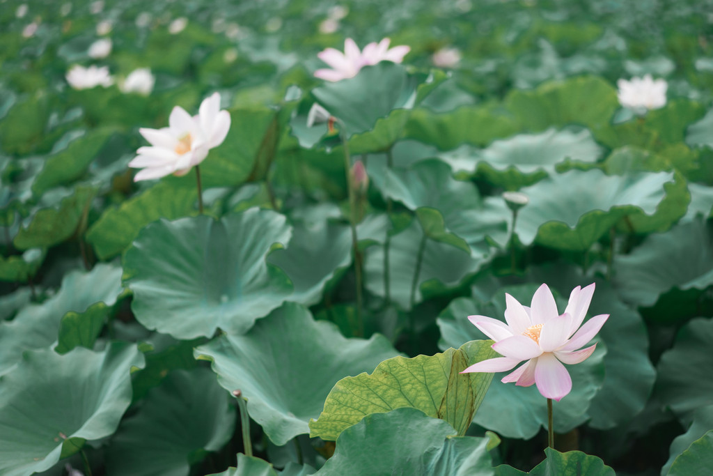 翠绿的荷叶丛中,亭亭玉立的荷花正盛开着,或白色或粉色,像一个个披着轻沙在湖上沐浴的仙女,含笑伫立,在微风中摇曳身姿娇羞欲语。