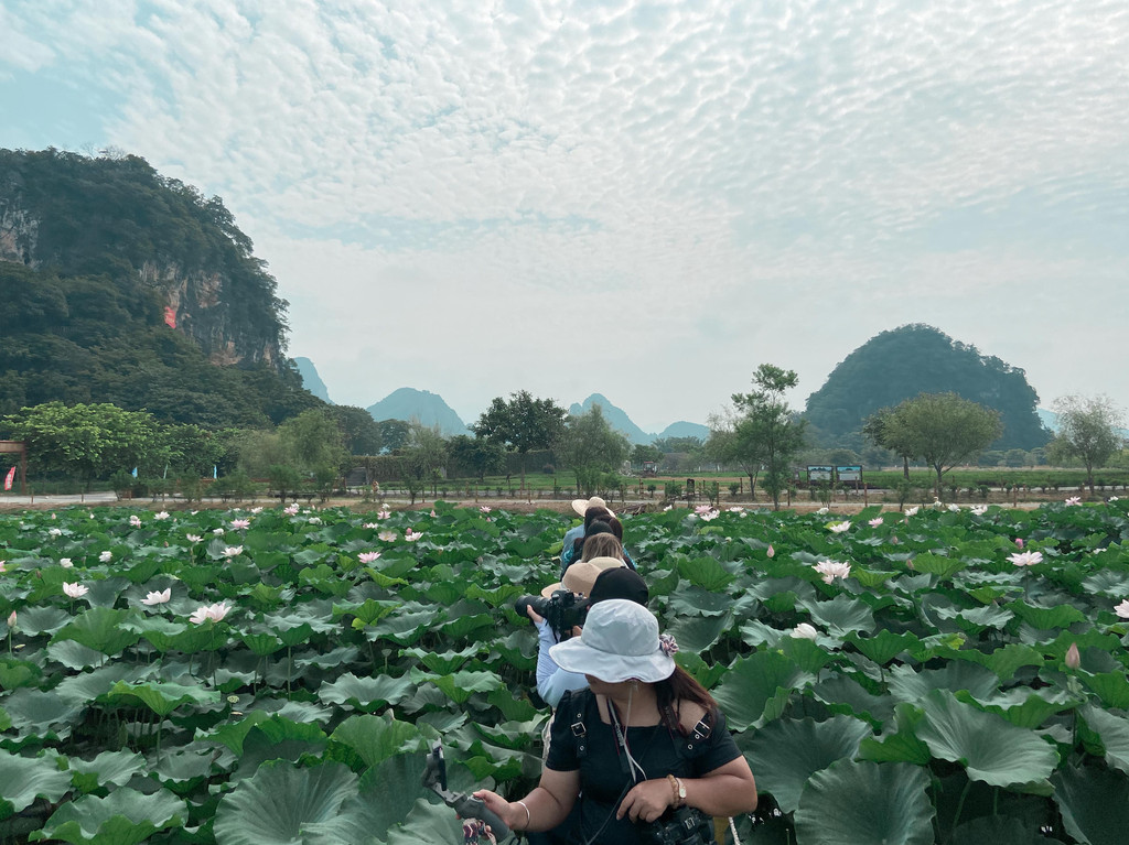 现在正是荷花盛开的时候,峰林莲湖300余亩的荷花正在热烈盛放,一眼望去,远处山峰映衬下的田田荷叶连绵不绝,期间或白色或粉色的荷花探出来,微风吹过,还带来阵阵的荷香。